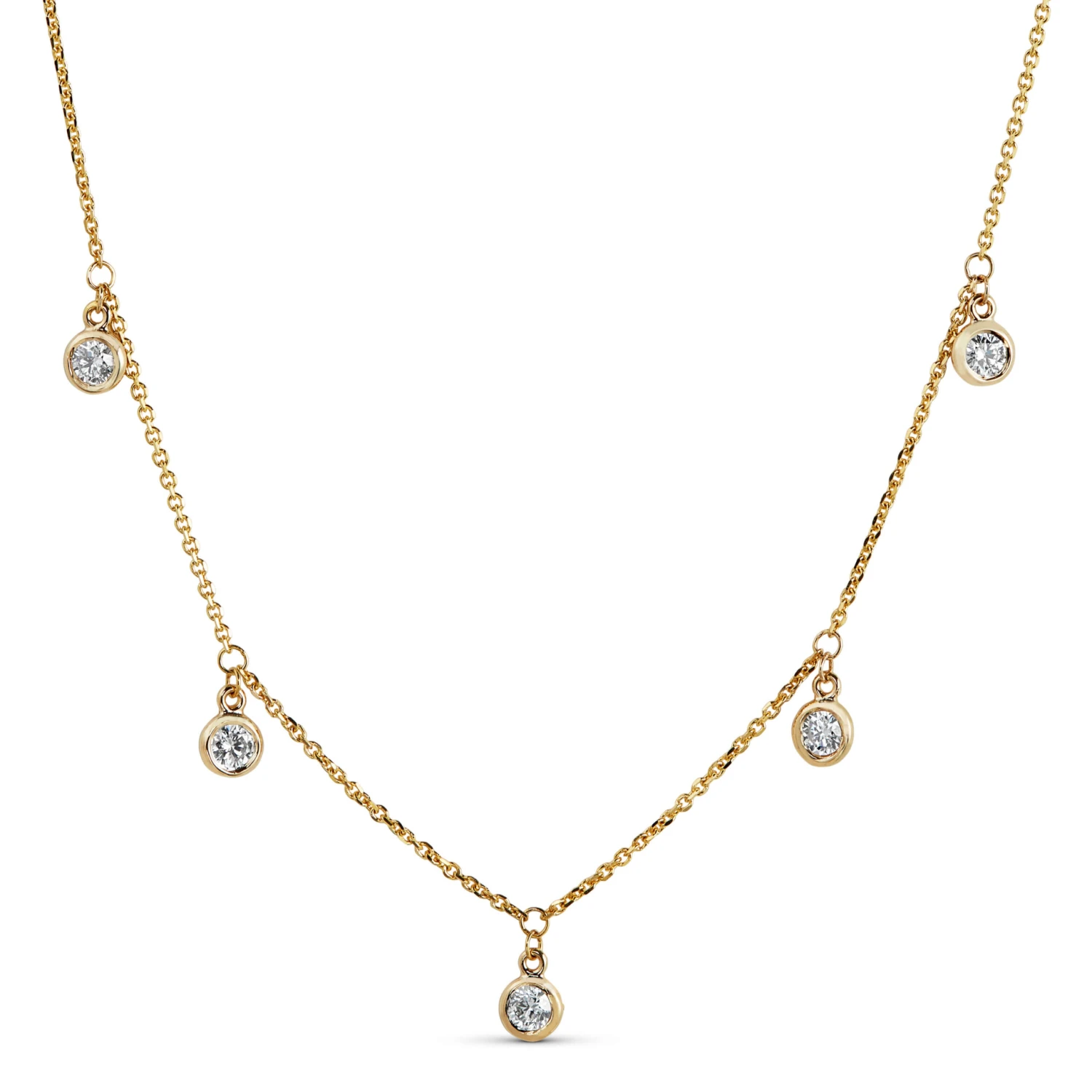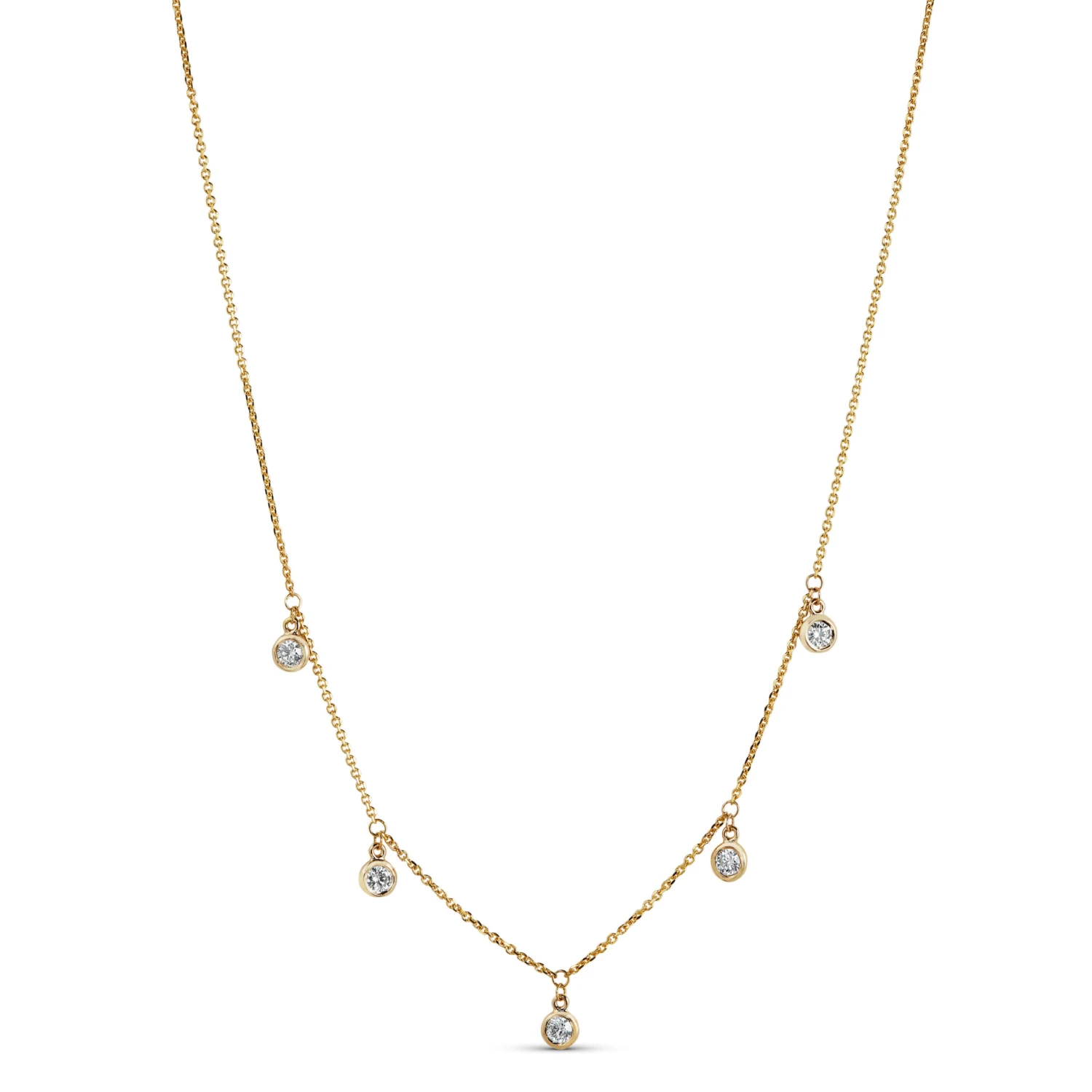 Embrace the glow with this 5-bezel diamond cluster necklace in glimmering 14k yellow gold. Five round cut diamond clusters dangle in bezel settings for ultimate elegance and sparkle. The gold chain features an extra loop for adjustability so you’ll always find the perfect fit.