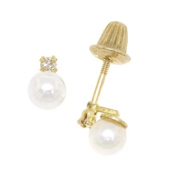 Baby earrings with freshwater cultured pearls and diamonds in 14K yellow gold, with safety back.