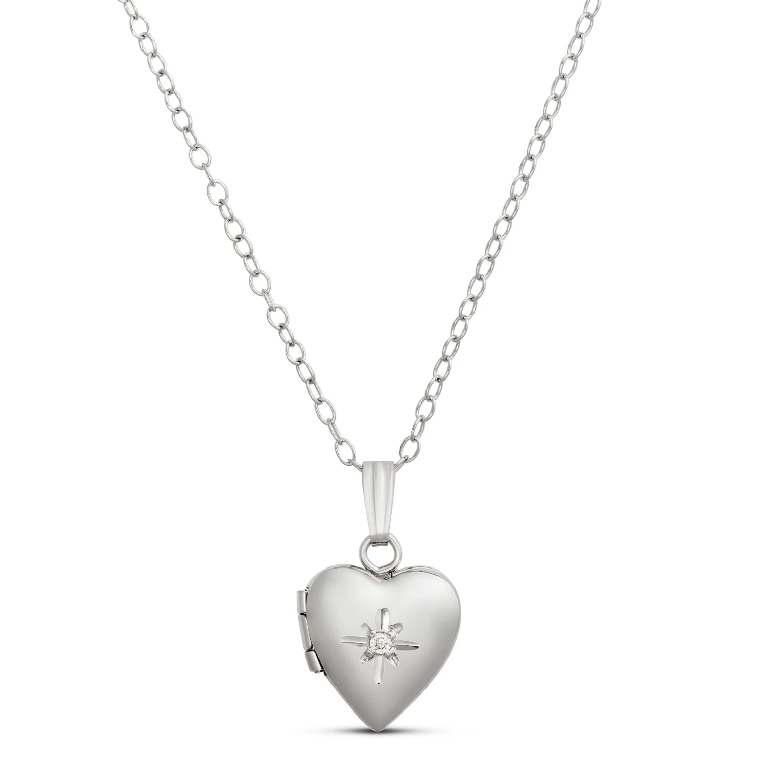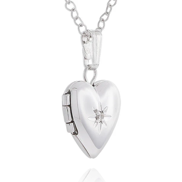Baby heart locket, 9 mm in diameter, with a .007ct diamond, in sterling silver. Delicate chain is 15 inches in length.
