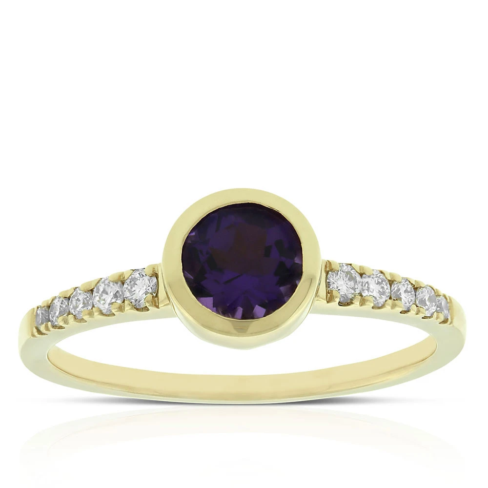 A line of diamonds presents a round amethyst for a ring that is sure to delight on any day. Head of ring is approximately 7mm in diameter.