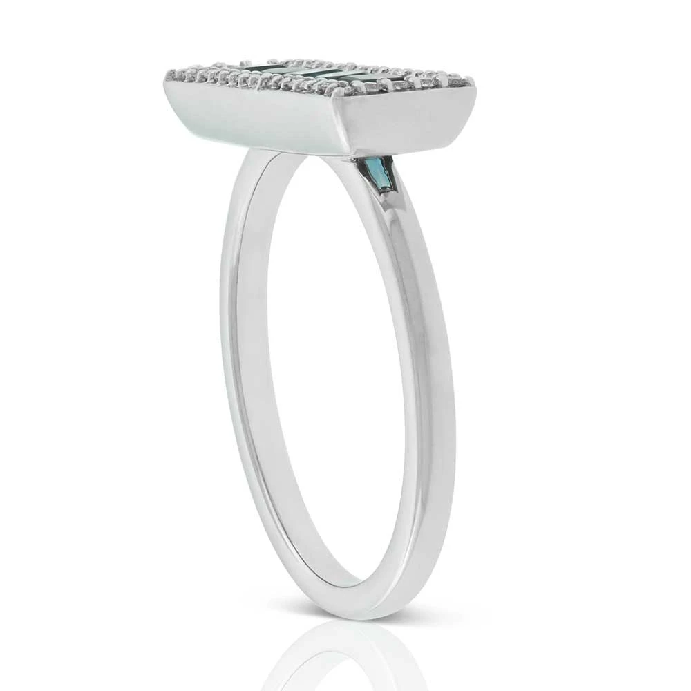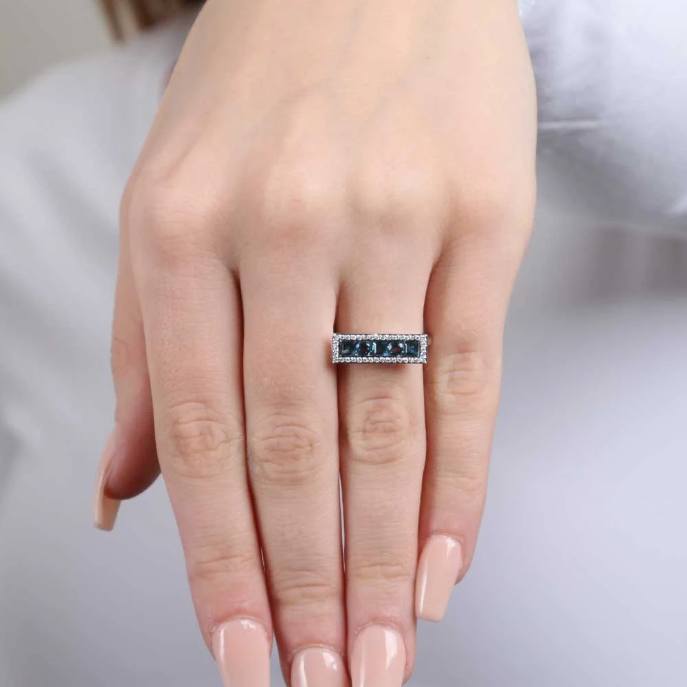 A line of square and round shaped blue topaz have been placed inside a diamond frame in this simple, modern ring design. Band is approximately 1mm wide, and rectangle is approximately 6 x 19mm.