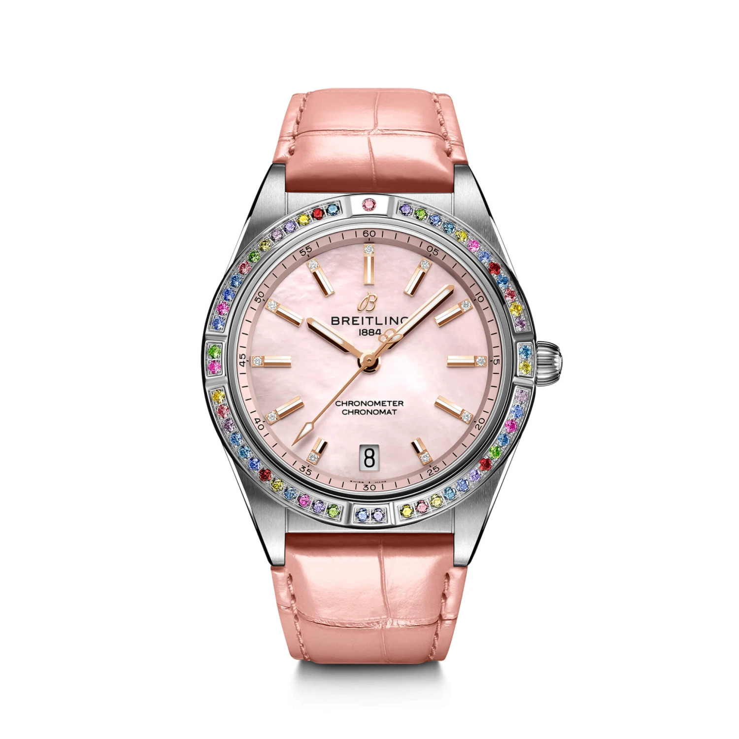 Eye-catching and bejeweled, the Chronomat South Sea Capsule Collection evokes a tropical paradise of golden beaches, aquatic depths, vibrant flora, and lush greenery. Featuring metallic and mother-of-pearl dials, diamond-set hour markers, and brightly hued gem-set bezels, the watches can be paired with either a matching alligator-leather strap or Breitling’s distinctive metal rouleaux bracelet. Embrace an endless summer with the Chronomat South Sea.