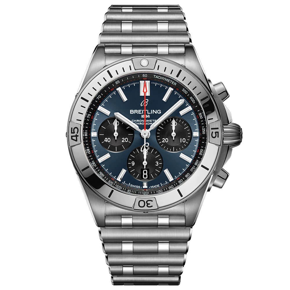 Breitling’s all-purpose watch for your every pursuit. The Chronomat holds a significant place in Breitling’s history. Introduced in 1984, at a time where extra-thin quartz timepieces were the order of the day, Breitling placed a bold bet on an impressively proportioned mechanical watch. Based on the Frecce Tricolori chronograph, which had been developed and launched in 1983 in collaboration with the famed Italian aerial squadron, the Chronomat celebrated Breitling’s centenary in style and marked the return of the mechanical chronograph to its rightfully prominent place at the brand which had built its global reputation on these incredible watches. The Chronomat features a 42mm stainless steel case and the iconic bezel with the four rider tabs. Featuring a blue dial with constasting black subdials, the Chronomat is matched to the signature “Rouleaux” bracelet and is powered by the in-house Breitling Manufacture Caliber 01, a COSC-certified chronometer.