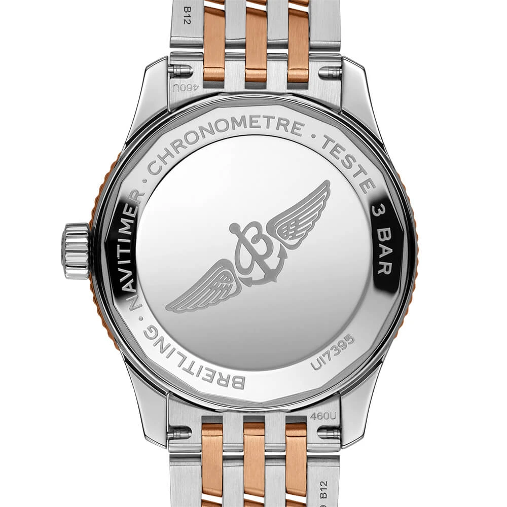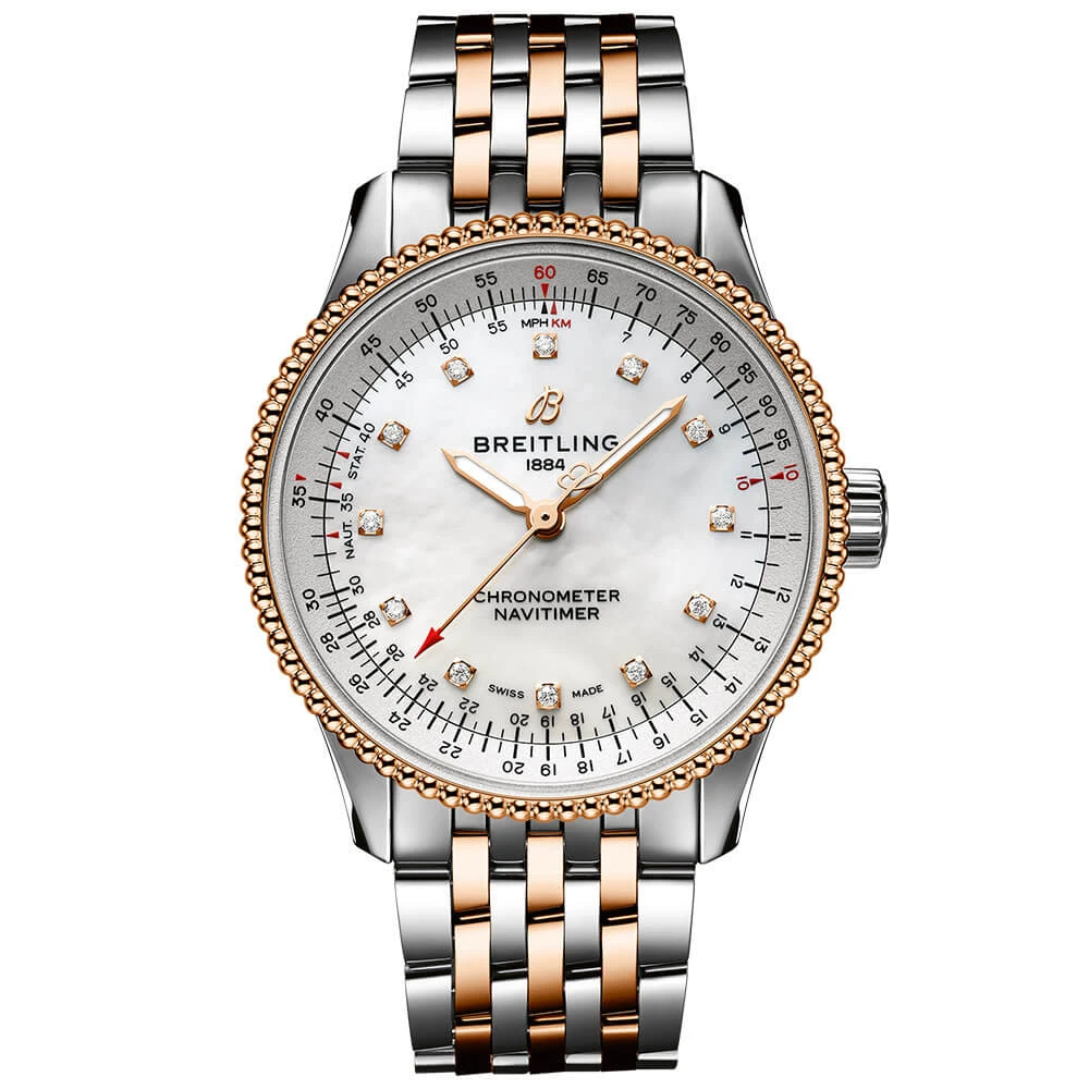 Refined and elegant, the Navitimer Automatic 35 combines the historic appeal of a true icon with the sophistication of a contemporary timepiece. The 35mm stainless steel case features a beaded 18K red gold bezel and a diamond-set white mother-of-pearl dial. Offered with a matchingtwo-tone bracelet that fits a stainless steel folding buckle, the Navitimer Automatic 35 is powered by the Breitling Caliber 17, a COSC-certified chronometer.