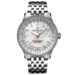 Refined and elegant, the Navitimer Automatic 35 combines the historic appeal of a true icon with the sophistication of a contemporary timepiece. The 35mm stainless steel case features a beaded bezel and a diamond-set white mother-of-pearl dial. Offered with a matching bracelet that fits a stainless steel folding buckle, the Navitimer Automatic 35 is powered by the Breitling Caliber 17, a COSC-certified chronometer.