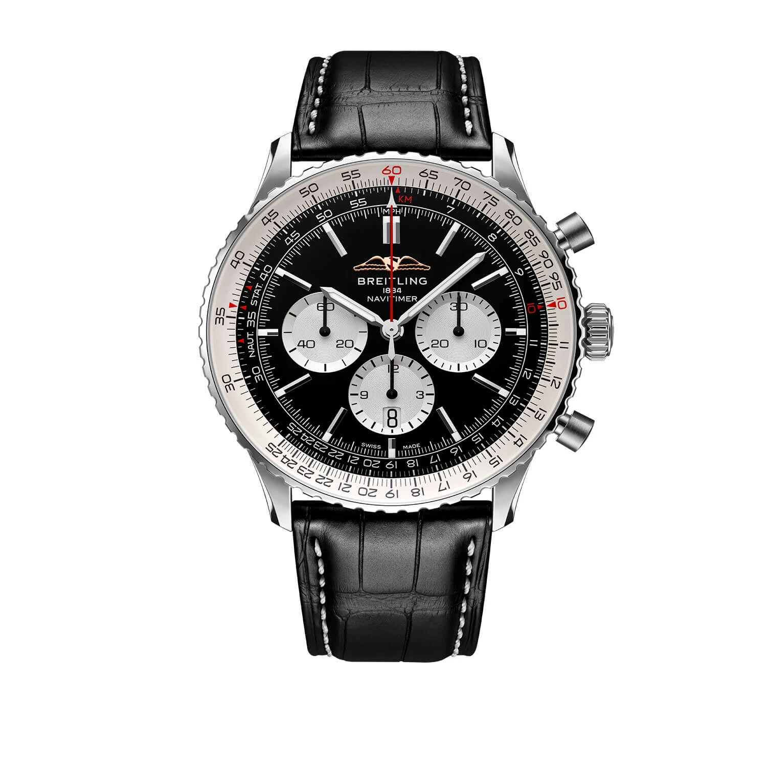 This model features the unique Navitimer look with special details like the AOPA logo, chronograph counter finishings, and an integrated date window. The case has been redesigned to be thinner, with polished-brushed finishings, flattened slide rule, and domed sapphire crystal. This watch’s strap is flat semi-shiny alligator leather with a folding clasp. The Breitling Navitimer is the original icon for pilots.