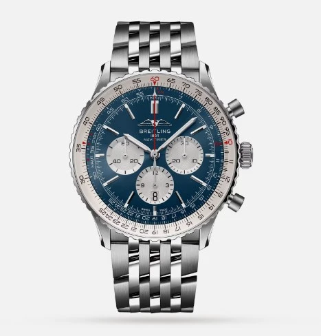This model features the unique Navitimer look with special details like the AOPA logo, chronograph counter finishings, and an integrated date window. The case has been redesigned to be thinner, with polished-brushed finishings, bidirectional slide rule, and open sapphire crystal. This watch’s strap is polished-brushed stainless steel 7-row bracelet. The Breitling Navitimer is the original icon for pilots.