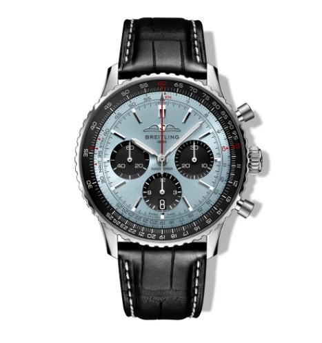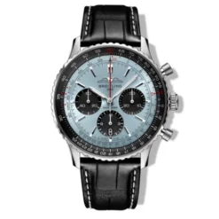 This model features the unique Navitimer look with special details like the AOPA logo, chronograph counter finishings, and an integrated date window. The case has been redesigned to be thinner, with polished-brushed finishings, bidirectional slide rule, and open sapphire crystal. This watch’s strap is flat semi-shiny black alligator leather with a folding clasp. The Breitling Navitimer is the original icon for pilots.