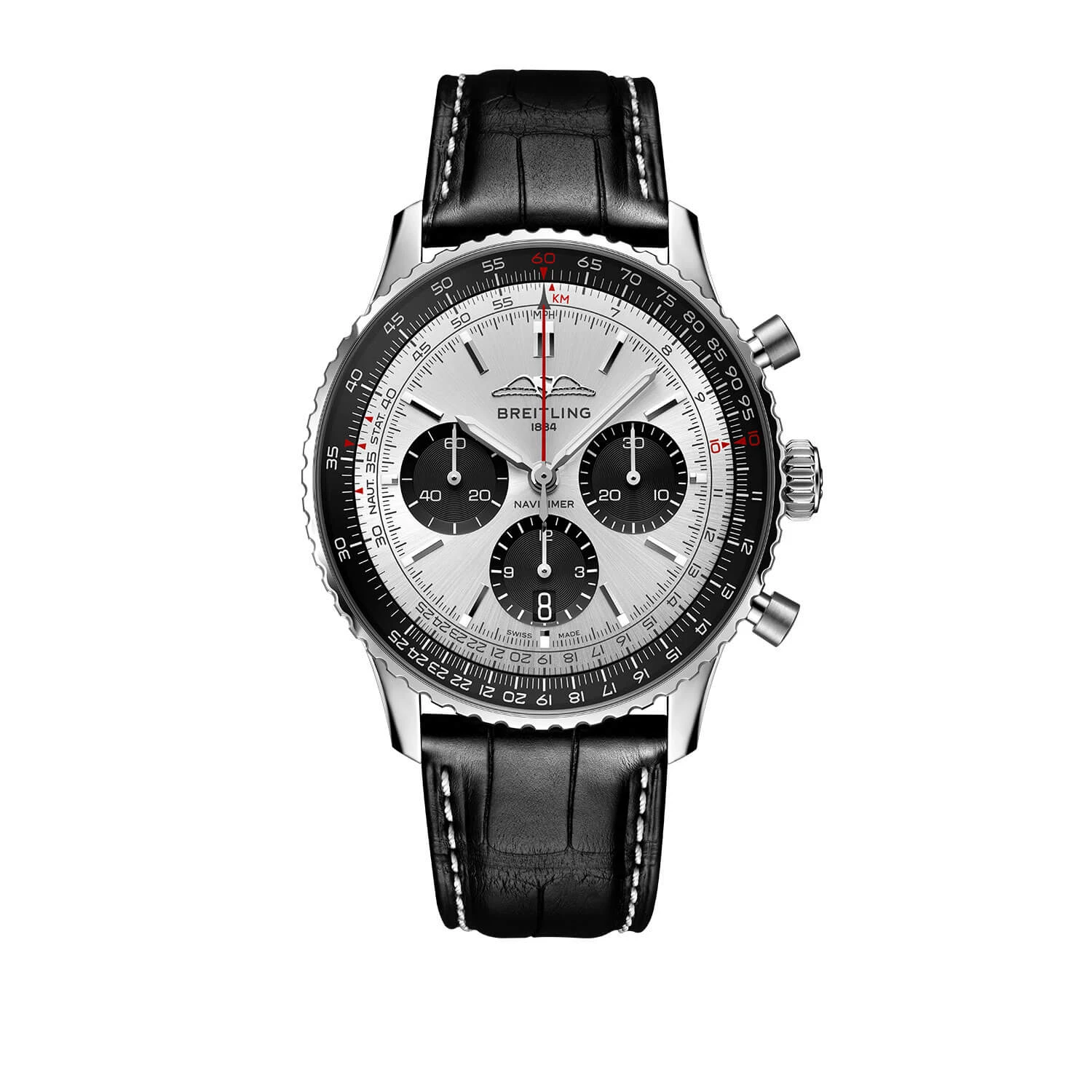 This model features the unique Navitimer look with special details like the AOPA logo, chronograph counter finishings, and an integrated date window. The case has been redesigned to be thinner, with polished-brushed finishings, bidirectional slide rule, and open sapphire crystal. This watch’s strap is flat semi-shiny black alligator leather with a folding clasp. The Breitling Navitimer is the original icon for pilots.