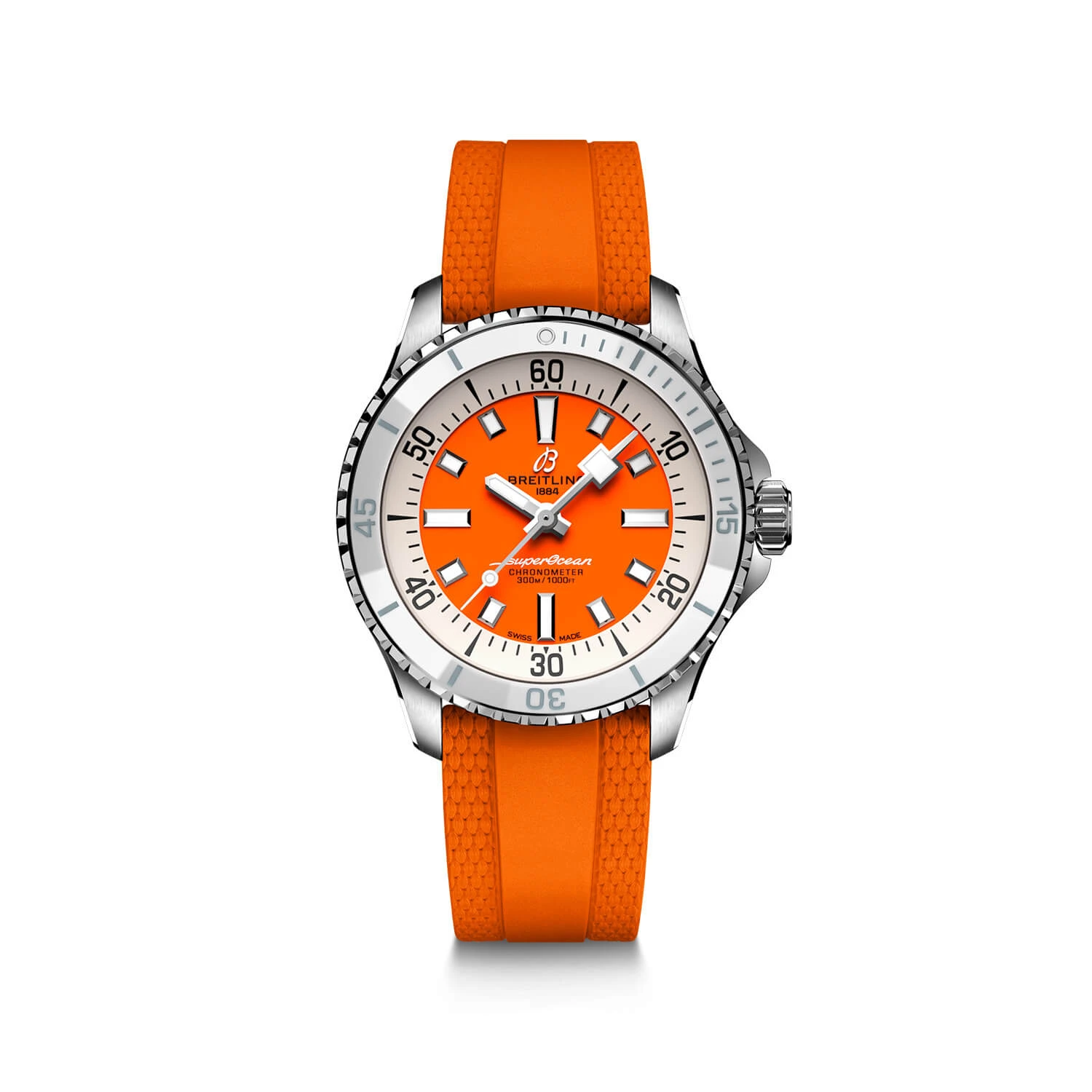Aside from looking good, the new Superocean is also technical marvel. Broad hands and indexes coated in luminescent Super-LumiNova® allow for superior readability underwater. At 300 m (1000 ft) water resistance, this watch triples the minimum requirement for dive watches. The strap has a folding clasp that allows for micro-adjustments of up to 15 mm for easy wear over rashies and dive suits. Its scratch-proof ceramic-inlayed bezel means it will never wear or fade. This watch is also shock-, sand- and saltwater-resistant. Its automatic Breitling Caliber 17 comes with a two-year warranty and approximate 38-hour power reserve.