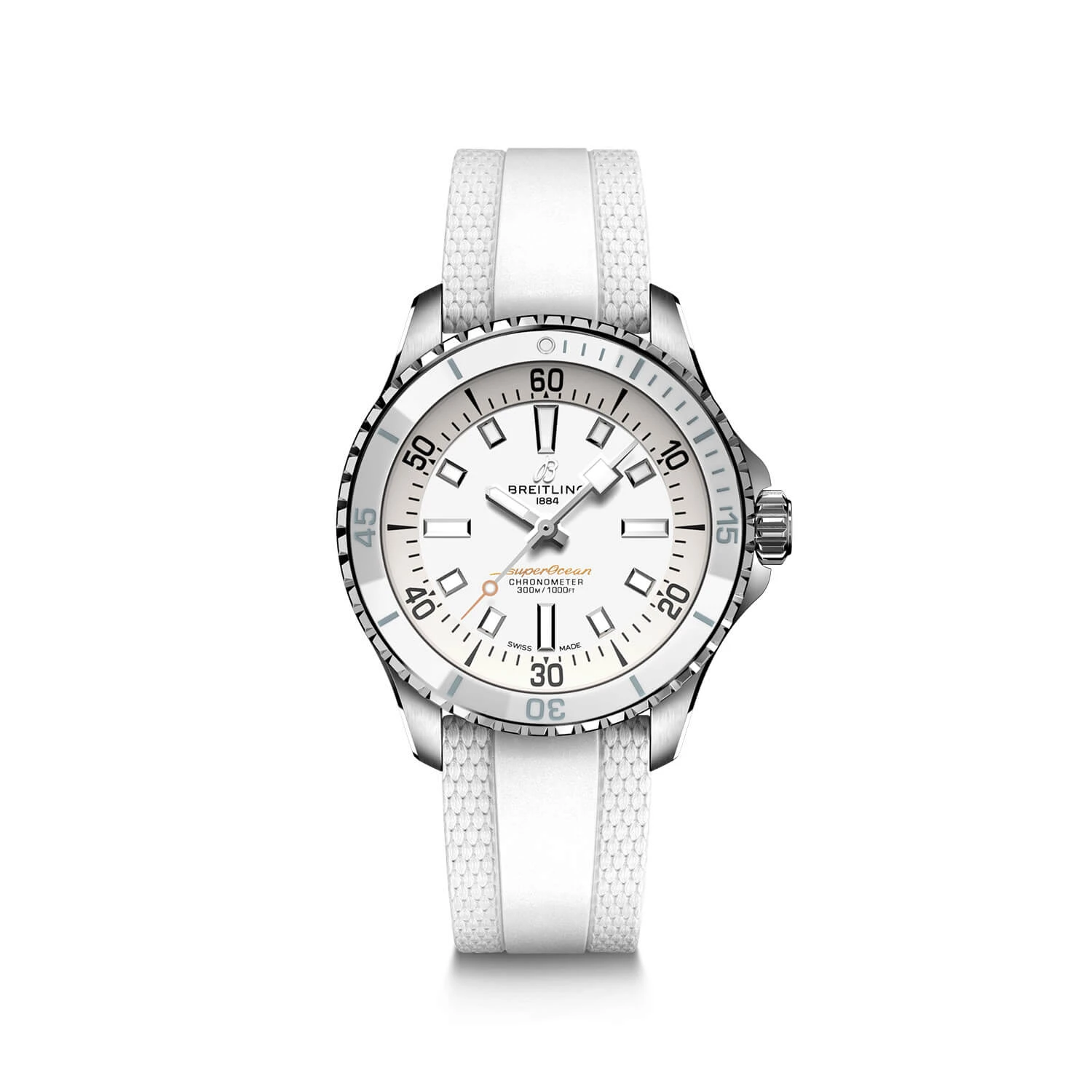 Aside from looking good, the new Superocean is also technical marvel. Broad hands and indexes coated in luminescent Super-LumiNova® allow for superior readability underwater. At 300 m (1000 ft) water resistance, this watch triples the minimum requirement for dive watches. The strap has a folding clasp that allows for micro-adjustments of up to 15 mm for easy wear over rashies and dive suits. Its scratch-proof ceramic-inlayed bezel means it will never wear or fade. This watch is also shock-, sand- and saltwater-resistant. Its automatic Breitling Caliber 17 comes with a two-year warranty and approximate 38-hour power reserve.