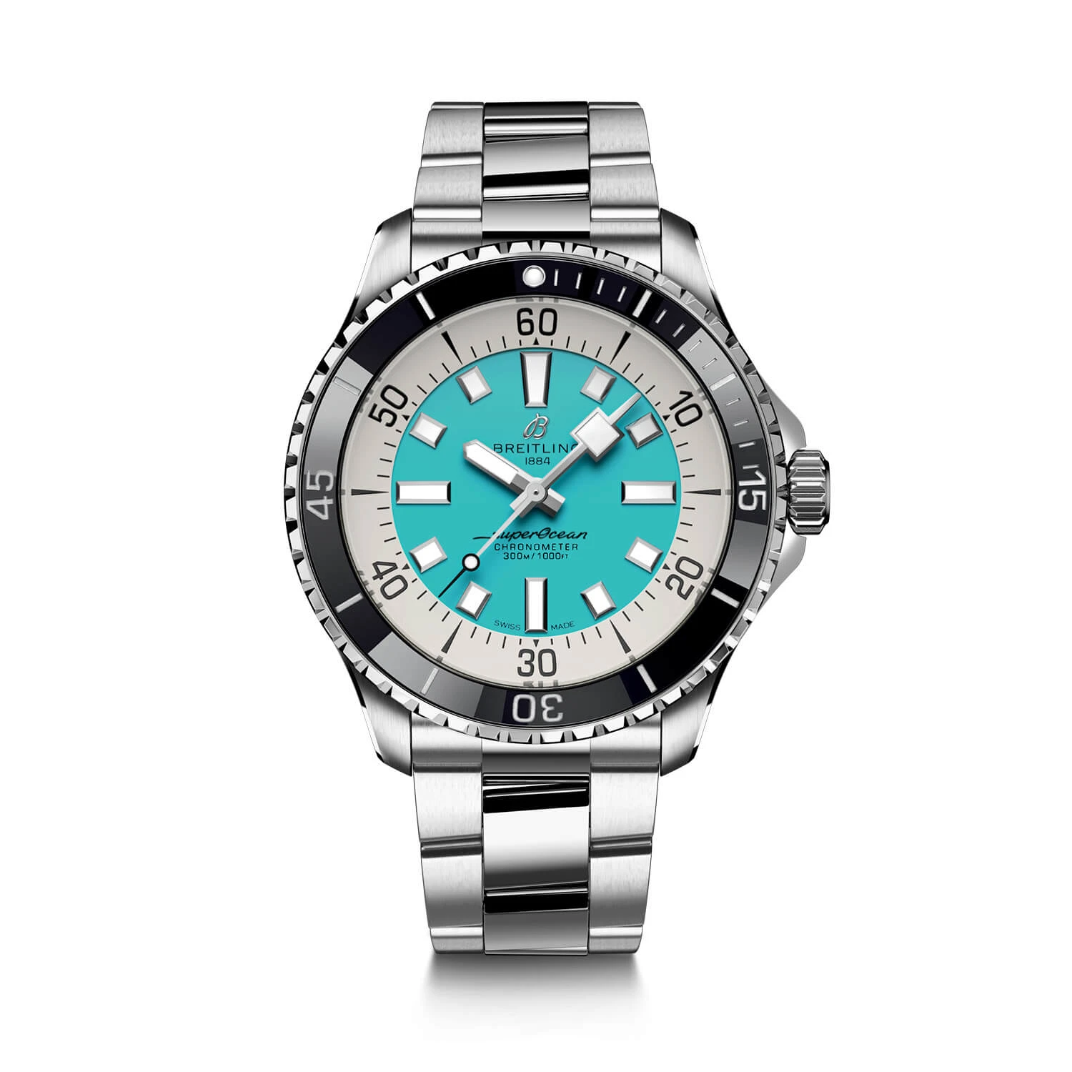 Aside from looking good, the new Superocean is also technical marvel. Broad hands and indexes coated in luminescent Super-LumiNova® allow for superior readability underwater. At 300 m (1000 ft) water resistance, this watch triples the minimum requirement for dive watches. The strap has a folding clasp that allows for micro-adjustments of up to 15 mm for easy wear over rashies and dive suits. Its scratch-proof ceramic-inlayed bezel means it will never wear or fade. This watch is also shock-, sand- and saltwater-resistant. Its automatic Breitling Caliber 17 comes with a two-year warranty and approximate 38-hour power reserve.