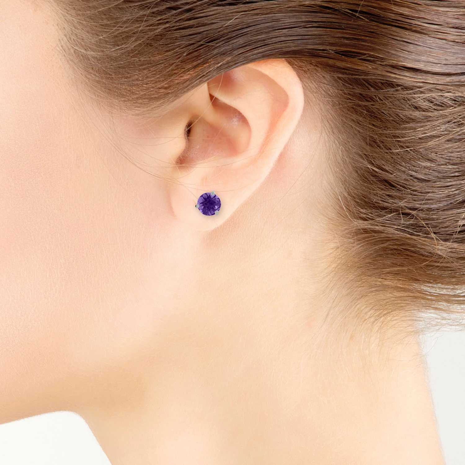 Round checkerboard cut amethyst stud earrings in 14K white gold, 6mm in diameter.
