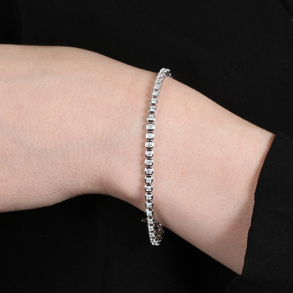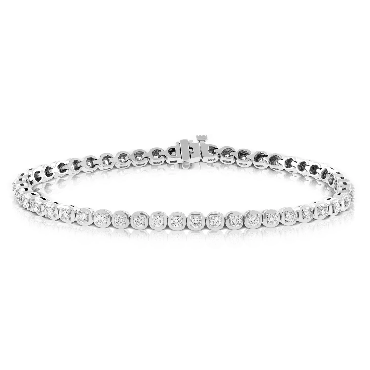 Round diamonds are set in cushion shaped white gold links giving you a bold tennis bracelet design. Push clasp closure with a value and latch for added security.