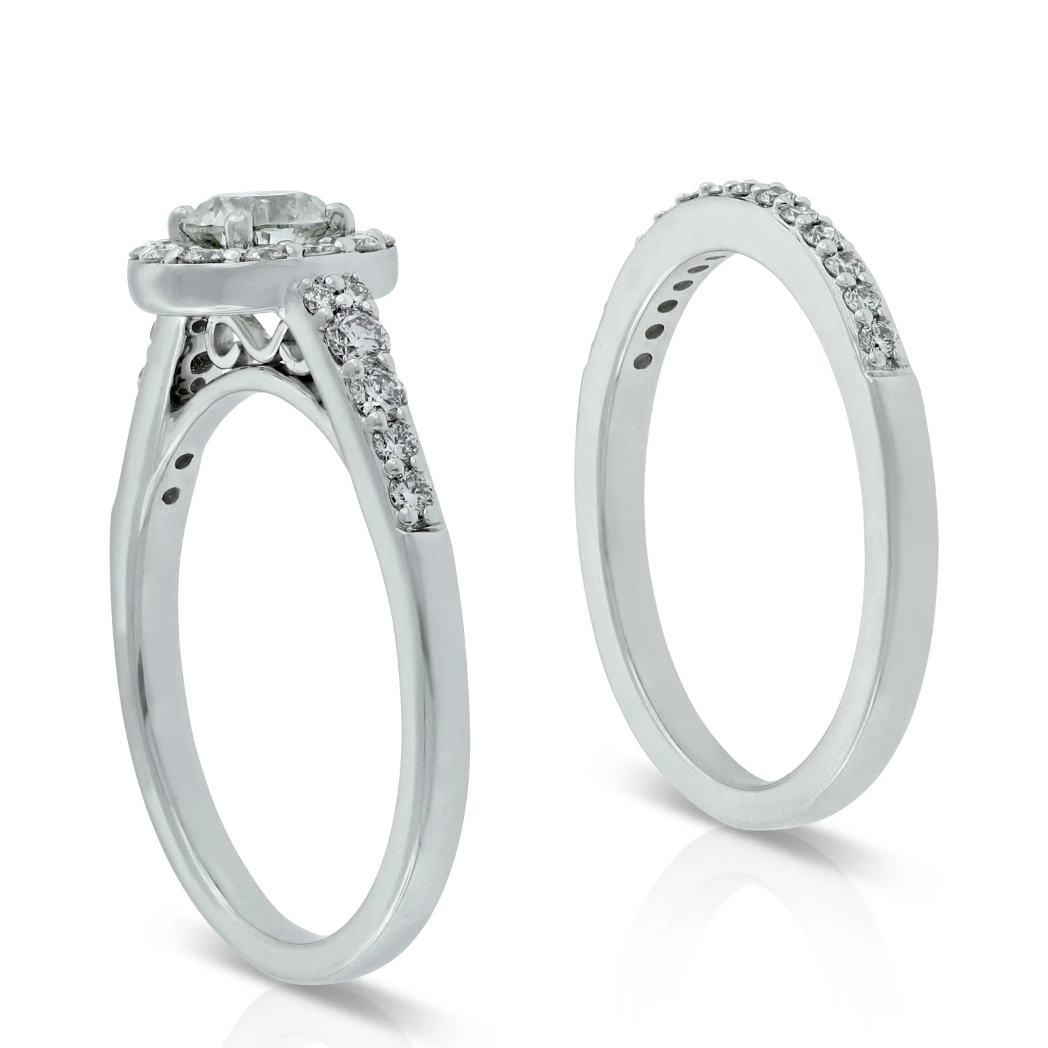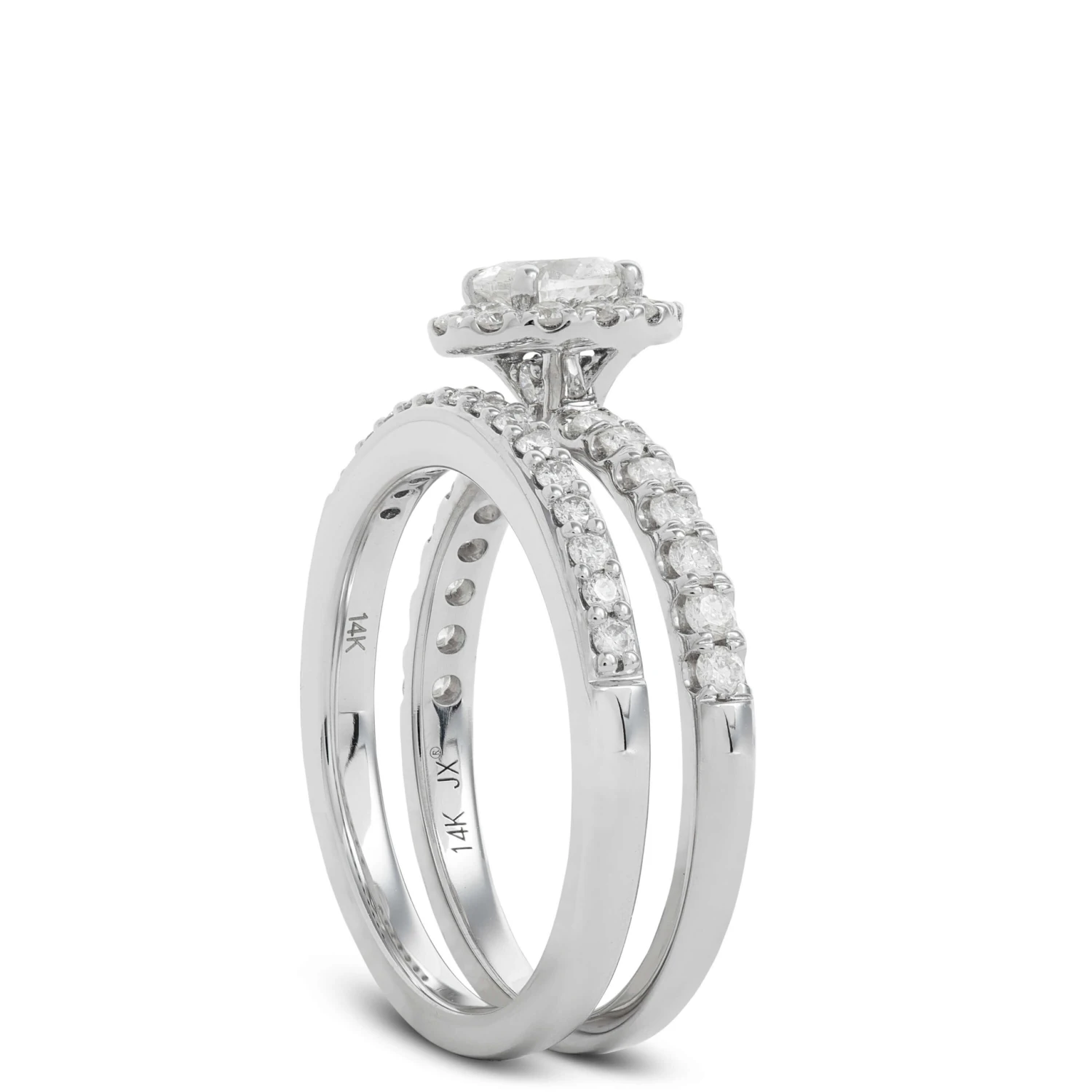 Two piece diamond wedding set in 14K white gold, with halo detailing. Center diamond is 1/2 carat, additional diamonds total another 1/2 carat.