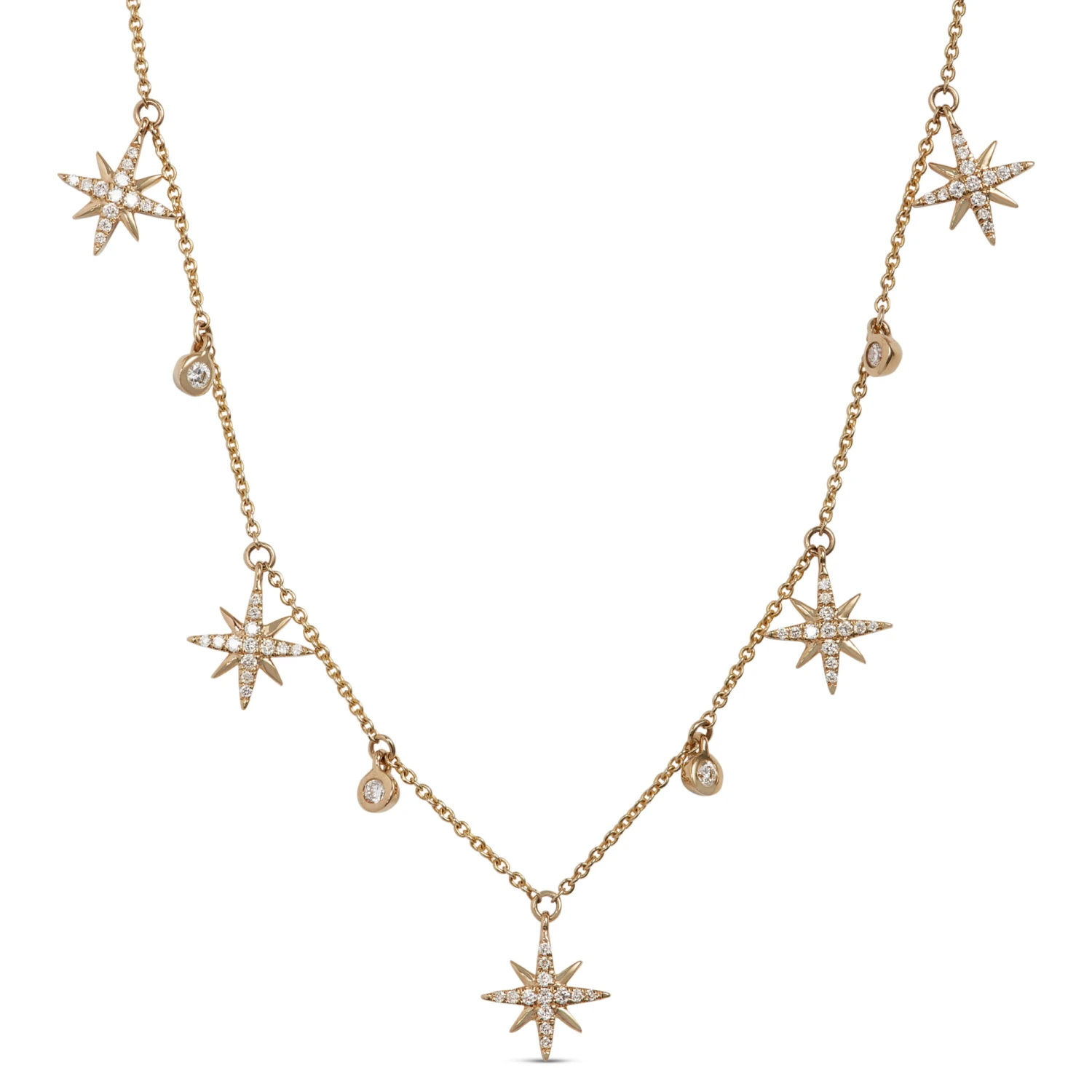 This dazzling gold necklace features bezel set diamonds among clusters of star shaped diamonds. A show stopping piece to ensure you stand out in a crowd.
