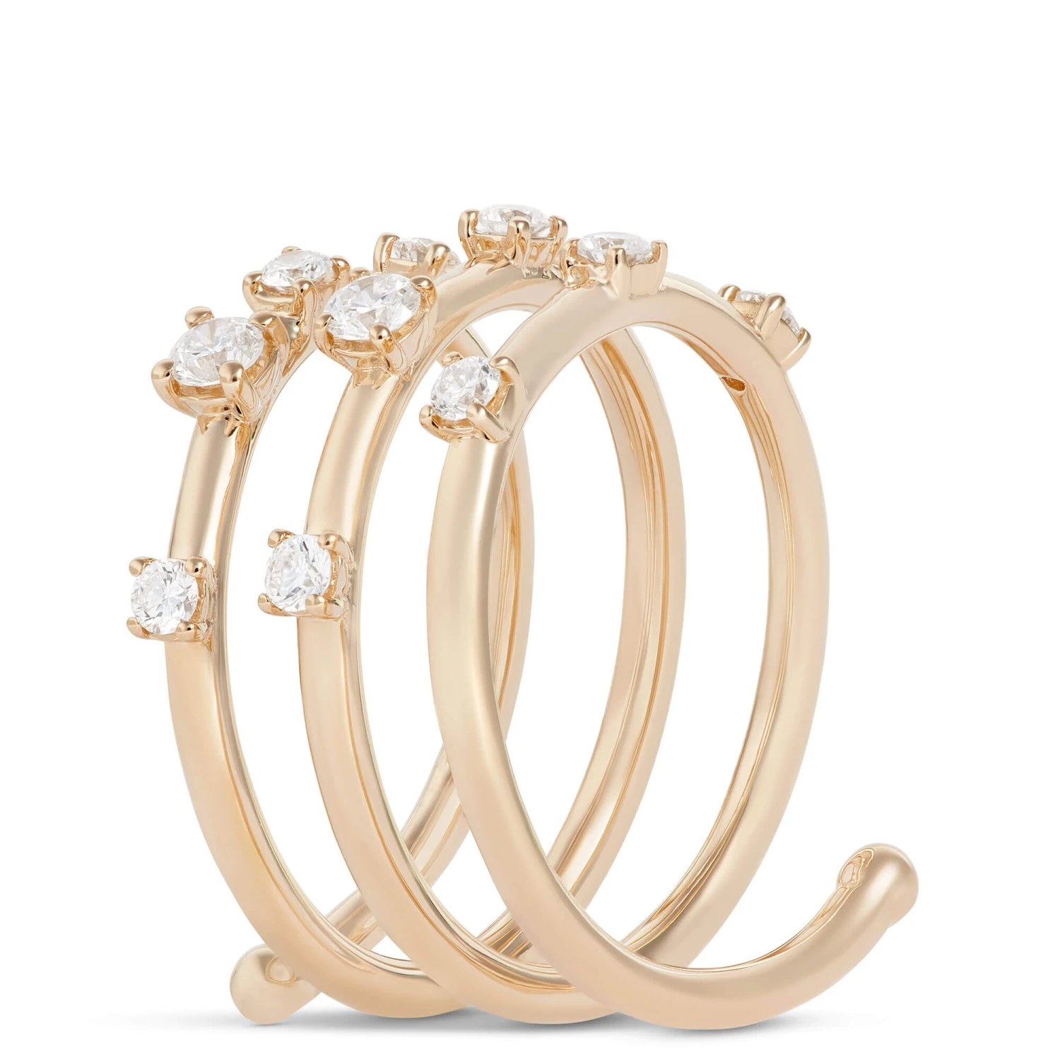 Eleven round cut diamonds sparkle in a coil of 14k yellow gold for timeless style with a modern edge. Prong settings expose more of the gemstone surface to maximize the light-catching glow. The wraparound ring gives you a distinct stacked look that’s sure to make a bold, yet elegant statement.