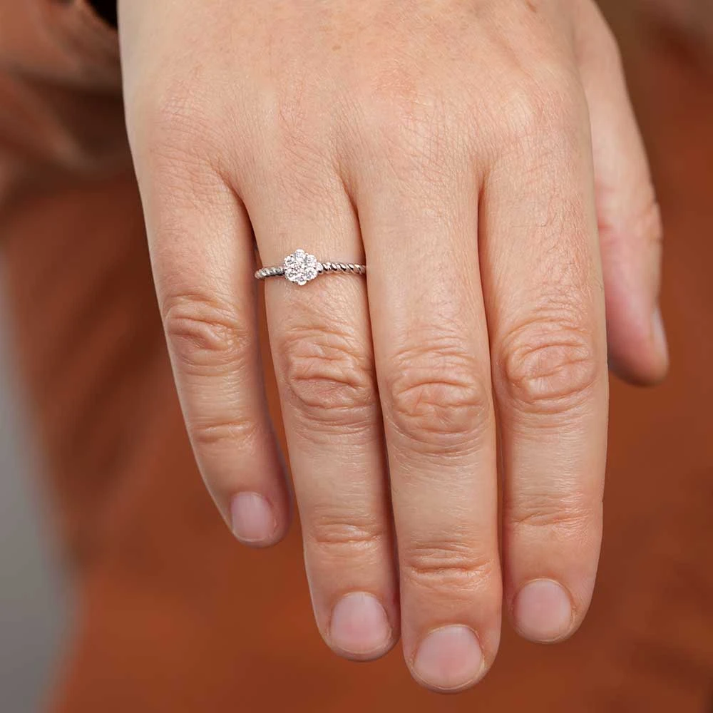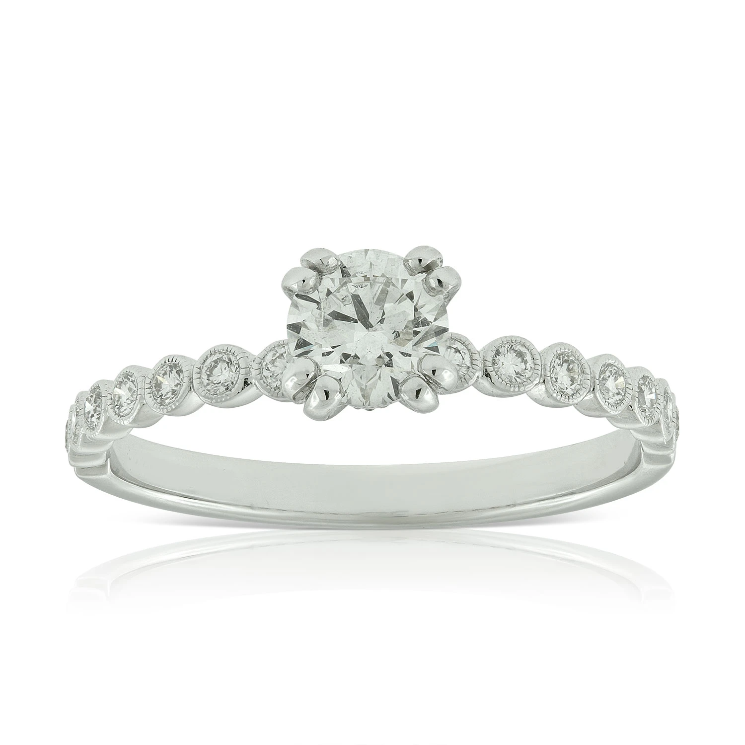 An updated look to a classic solitaire, this version has bezel set diamonds on the band as well as double prongs for the center stone.