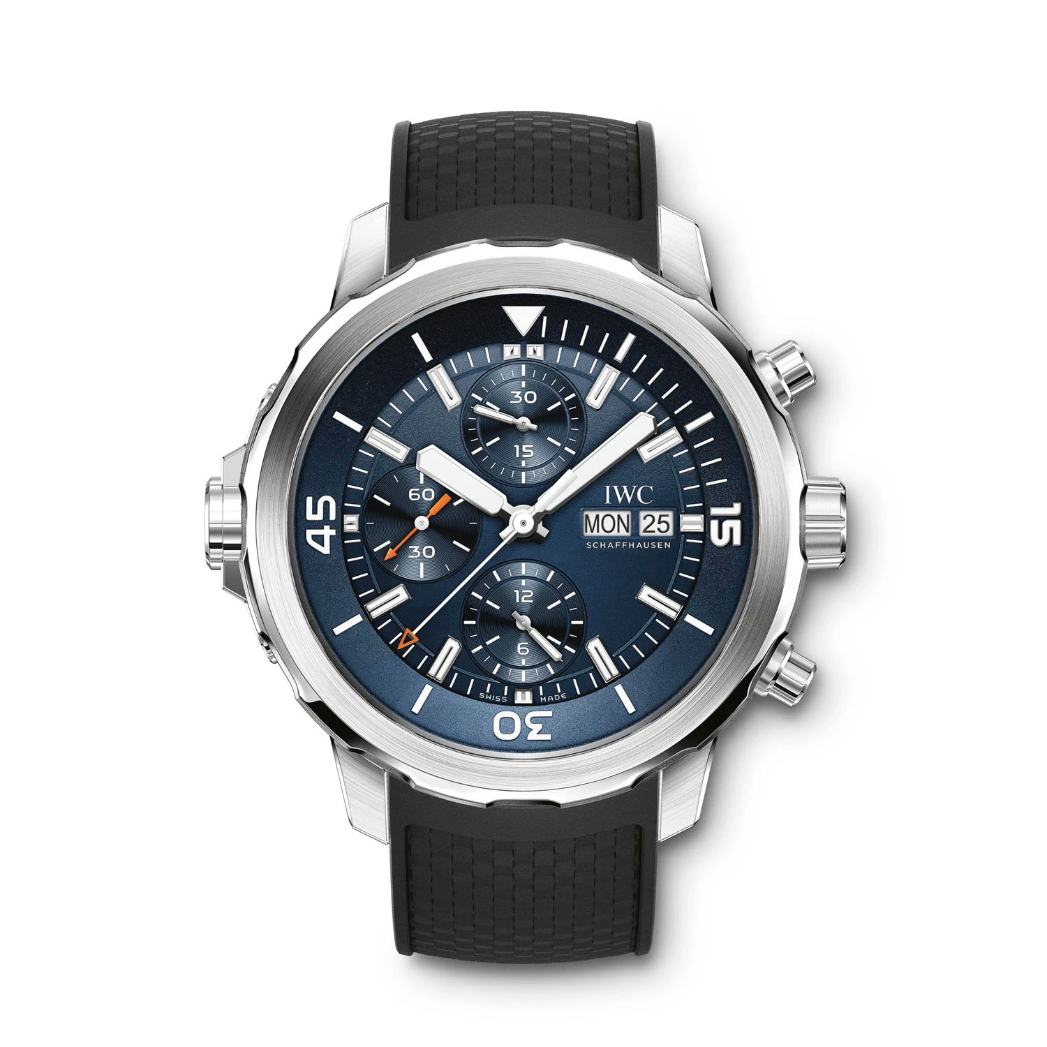 The watch devoted to Cousteau is technically identical with the Aquatimer Chronograph. The distinctly puristic design of the dial references the look of the first Aquatimer released in 1967 – even with three sub-dials and a date and day display, the blue dial is remarkably uncluttered. The innovative external/internal rotating bezel with a SafeDive system designed to prevent inadvertent changes of the dive time boosts the practical use of the diver’s watch, as does the increase in water-resistance to 30 bar. The chronograph function handles single stop times and aggregate timing up to 12 hours, while the push-values can be activated even underwater. The engraving on the back of the cover shows “le Commandant” with his trademark woolen beanie.