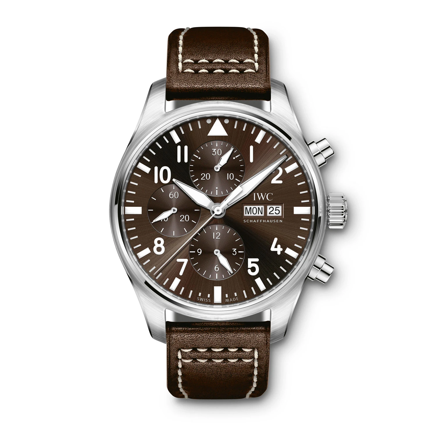 The Pilot’s Watch Chronograph Edition “Antoine de Saint Exupéry” of course features a brown dial and typical calfskin strap – the latter inspired by the flying suit worn by the French author and pilot. A clearly organized dial and excellent legibility even under the most demanding conditions are the key features of the Pilot’s Watch Chronograph. Thanks to the robust 79320-calibre chronograph movement, it is possible to record single and aggregate times of up to 12 hours. The sub-dials at “12” and “6 o’clock” are used for aggregate timing while the seconds hand at “9 o’clock” indicates that the watch is running normally. The movement has optimum protection against the effects of external magnetic fields in the form of a soft-iron inner case. Watch is sold with a strap from Santoni. Brown dial.