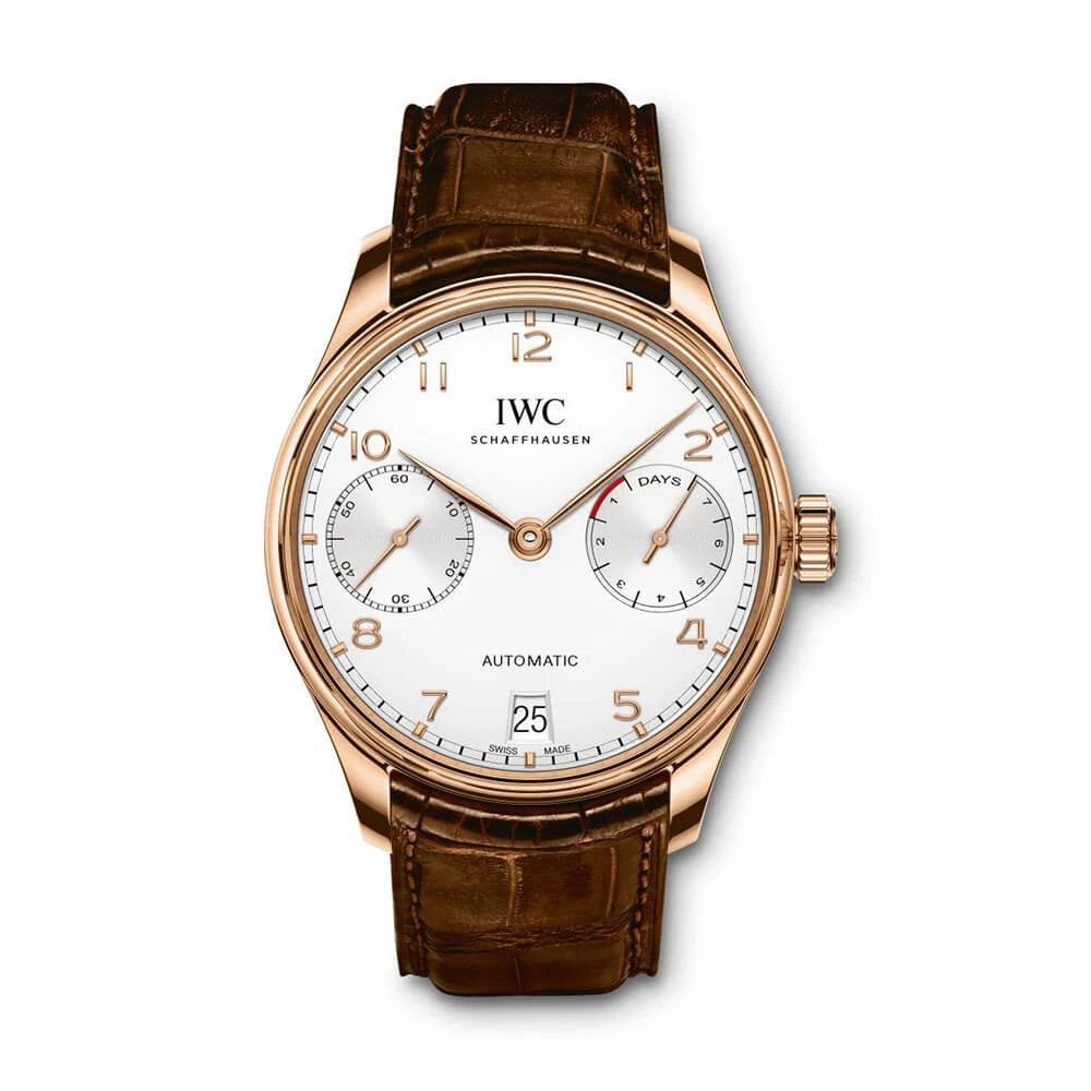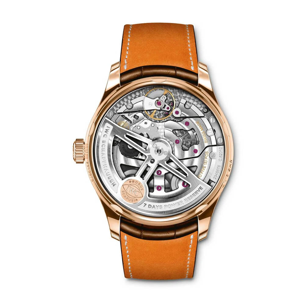 The Portugieser Automatic has become one of the most successful Portugieser models ever to be produced in Schaffhausen. The balanced dial design retains the classic appeal of the legendary original Portugieser first manufactured in the 1930s. The pawls, automatic wheel and rotor bearing in the legendary Pellaton winding system are made from extremely wear-resistant ceramic, while two barrels build up an impressive 7-day power reserve. The ergonomically optimized strap horns ensure greater comfort even on slimmer wrists. This Portugieser Automatic comes with a 42.3mm 18K 5N rose gold case, silver-plated dial and solid gold appliqués. Thanks to the slimmed-down rotor, a glance through the transparent sapphire-glass back reveals even more details of the IWC-manufactured 52010-calibre, such as the black ceramic pawls in the winding system or the Geneva stripe decoration.
