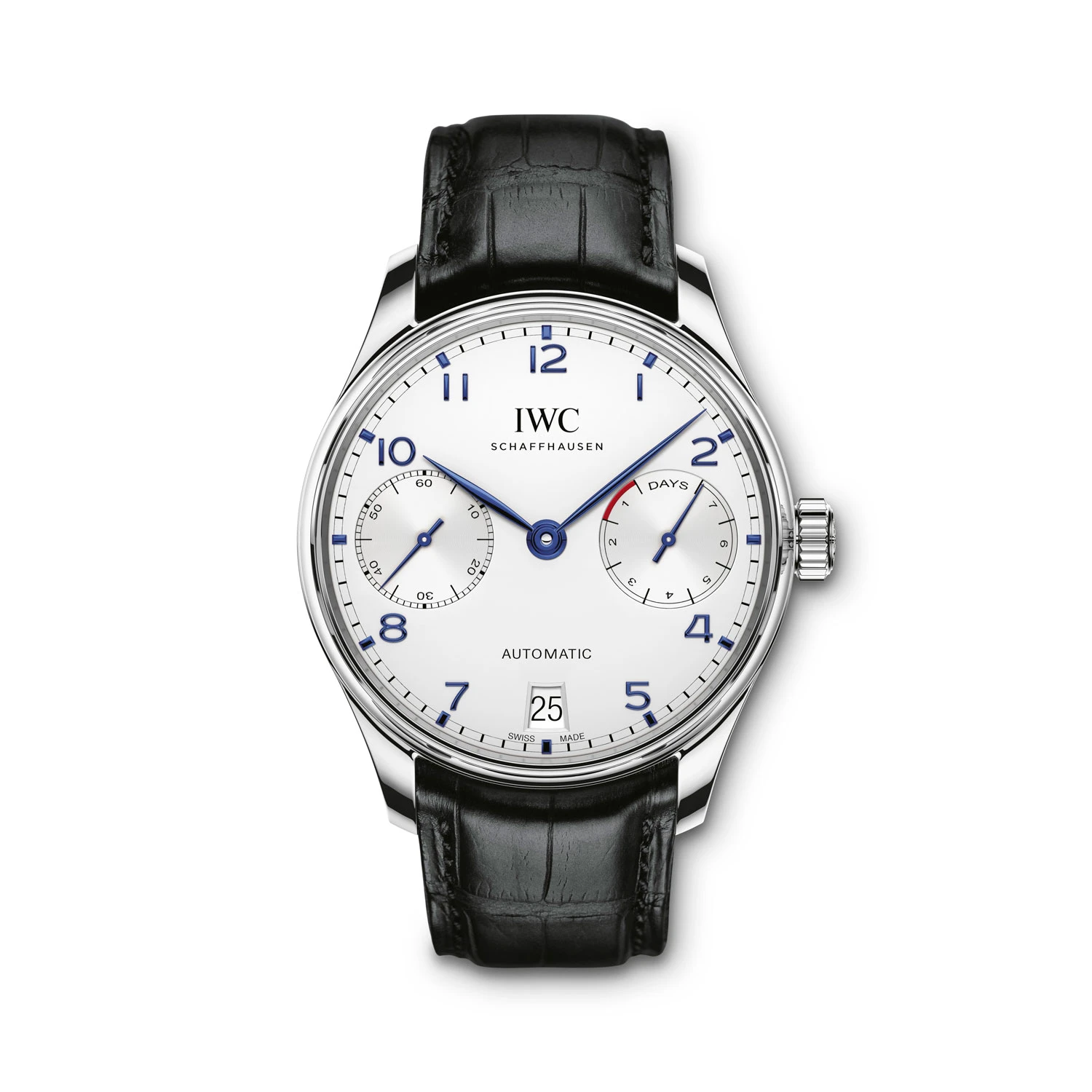 The Portugieser Automatic has become one of the most successful Portugieser models ever to be produced in Schaffhausen. The balanced dial design retains the classic appeal of the legendary original Portugieser first manufactured in the 1930s. The pawls, automatic wheel and rotor bearing in the legendary Pellaton winding system are made from extremely wear-resistant ceramic, while two barrels build up an impressive 7-day power reserve. The ergonomically optimized strap horns ensure greater comfort even on slimmer wrists. The Portugieser Automatic is available with a 42.3-millimetre stainless-steel case, silver-plated dial and blue hands and appliqués. Thanks to the slimmed-down rotor, a glance through the transparent sapphire-glass back reveals even more details of the IWC-manufactured 52010-calibre, such as the black ceramic pawls in the winding system or the Geneva stripe decoration.