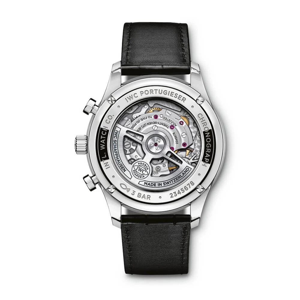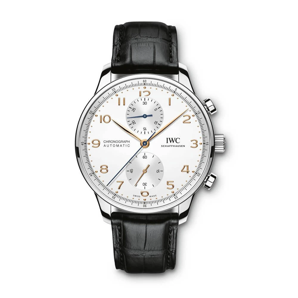 The Portugieser Chronograph is one of IWC Schaffhausen’s most iconic models. With its compact diameter of 41mm, it fits almost any wrist. However, the thin bezel gives one the impression of wearing a significantly larger watch. The clear, functional dial boasts applied Arabic numerals and slender Feuille hands. Printed with a quarter-second scale, the characteristic réhaut not only allows precise reading of the stop time but also reminds us of the Portugieser’s origins as a nautical precision instrument for the wrist. This model features a stainless steel case, a silver-plated dial, as well as golden hands and appliqués; it is fitted with a black alligator leather strap. Inside the sporty-elegant chronograph, the IWC-manufactured 69355 calibre is at work. The robust and precise chronograph movement in classic column-wheel design is visible through a sapphire-glass case back.