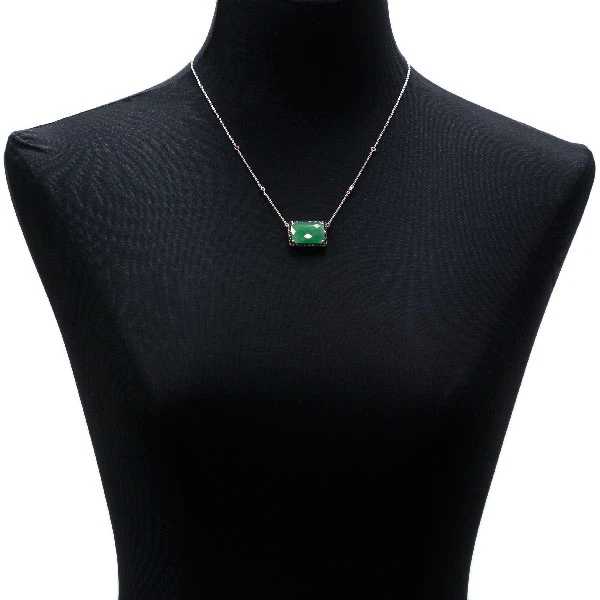 Lisa Bridge statement necklace with dyed green chalcedony set horizontally in a frame of black sapphires for bold color with sophisticated contrast. Necklace is crafted of sterling silver with four bezel-set black sapphire stations, showcasing a rectangular chalcedony with modified checker cut for facets that gleam from every angle. Necklace measures 20 inches in length with sizing adjustments at 18 and 19 inches, and has a detailed gallery finished with Lisa’s signature L at back.