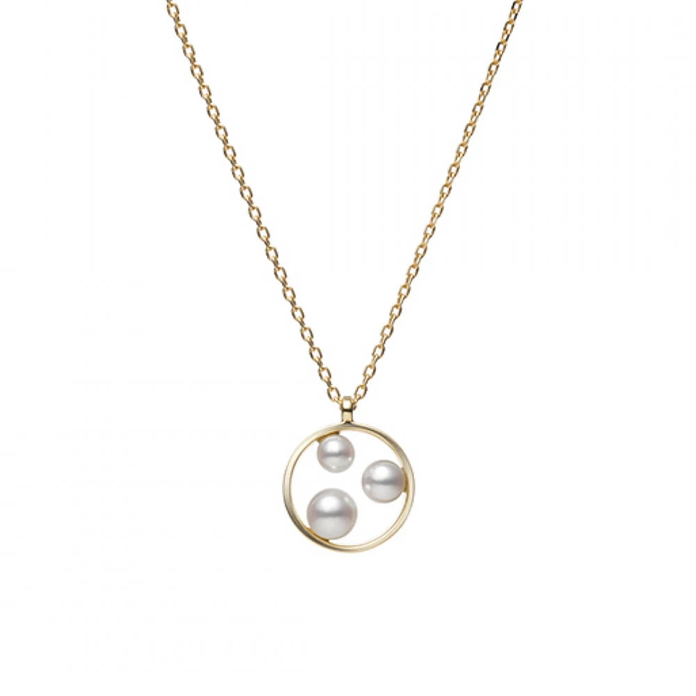 Three graduating Akoya cultured pearls float within a high polished yellow gold circle for a stylish pendant design. Chain is 18 inches long with a sizing loop at 16 inches for shorter wear.