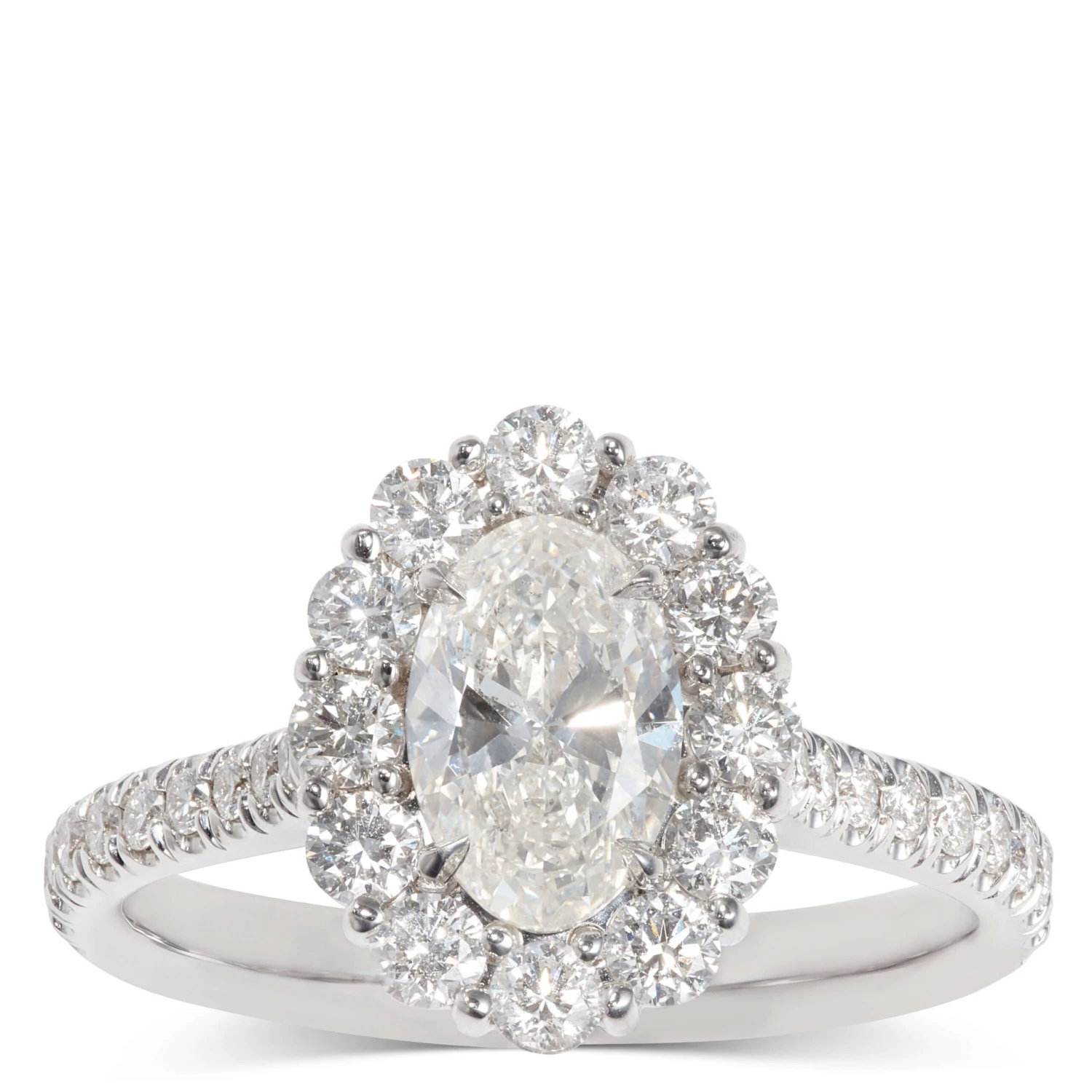 A 1.01 ct. oval diamond held in a halo of twelve round diamonds makes for a classically beautiful design with truly stunning sparkle. GIA cert #1385551141.