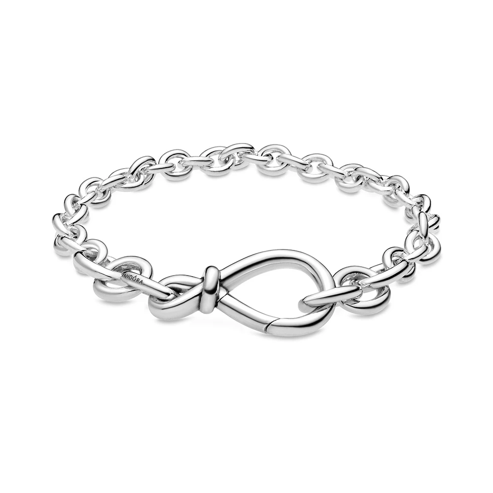 It’s double the love with Pandora’s unique interpretation of the infinity symbol. The iconic knot wraps around the asymmetrically-set center to signify the strength of the connection. This chunky sterling silver infinity knot bracelet is the perfect representation of an unbreakable bond and a classic addition to your bracelet collection. The infinity clasp opens and can be styled with up to two Pandora Moments dangle charms or pendants.