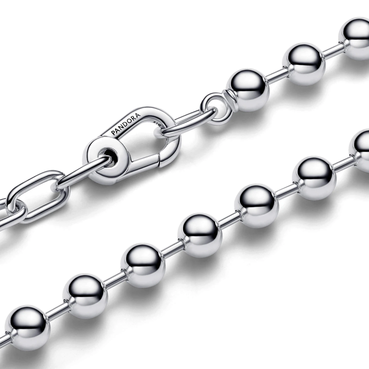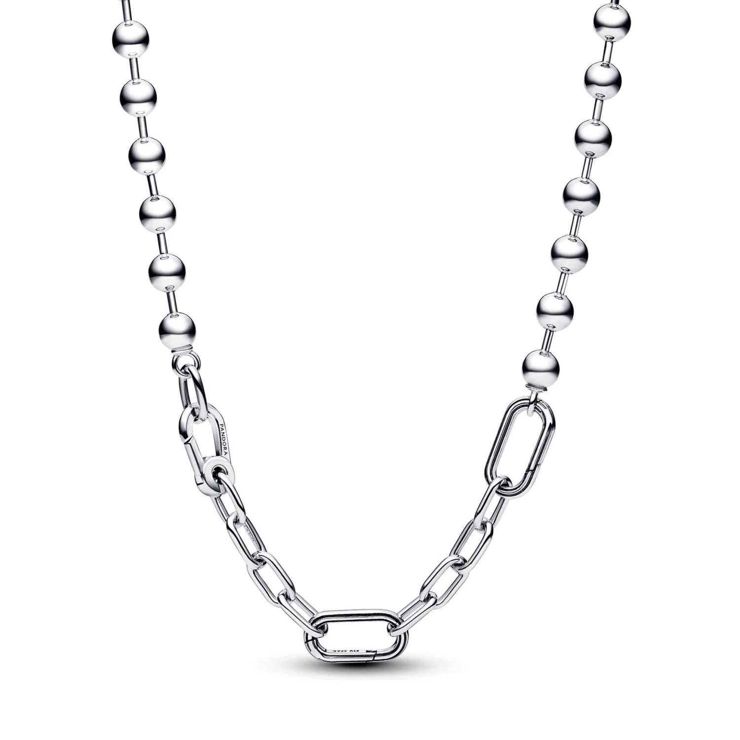 The Pandora ME Metal Bead & Link Chain Necklace proves that opposites attract. Pairing two essential styles � metal beads and chain links � this sterling silver necklace can be customised by styling the links with mini dangle charms or medallion charms. Balancing 90s punk rock influences with the timelessness of sleek silver, this statement necklace can stand alone or be paired, layered and styled in fresh ways every day.
