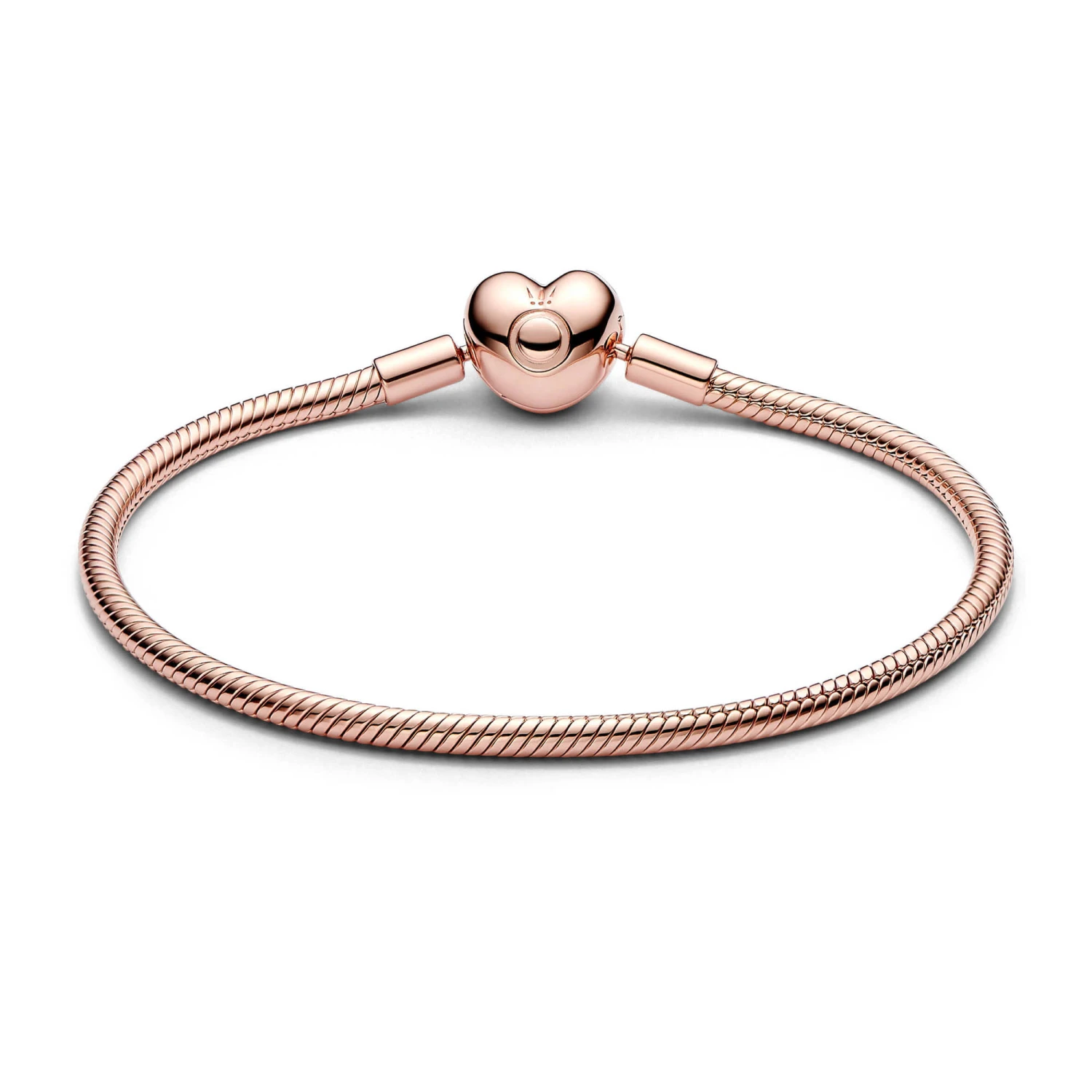 Make your story shine with the Pandora Moments Heart Clasp Snake Chain Bracelet. Our iconic snake chain bracelet gets a gleaming update in 14k rose gold plating, with a polished heart-shaped clasp. The clasp includes an engraved Pandora logo on one side and the Pandora Crown O logo on the other. Style this Pandora snake chain bracelet with up to 16 to 18 charms for an iconic everyday look that is all yours.
