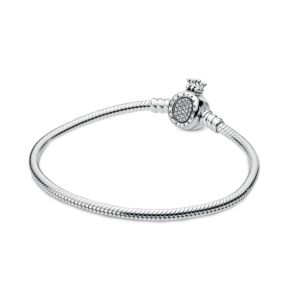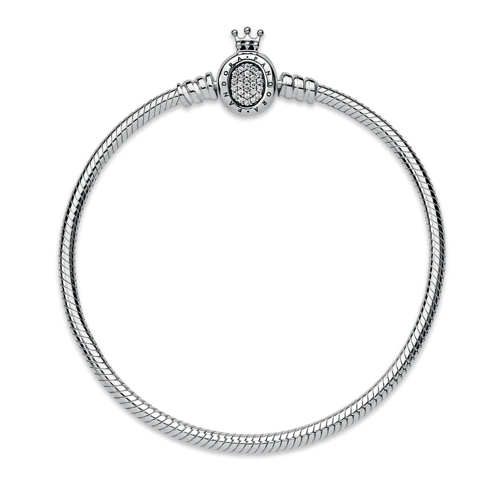 Give your fairy tale a new beginning with the iconic Pandora Moments snake chain bracelet with Pandora crown O clasp. Made from Pandora’s instantly recognizable sterling silver snake chain, the bracelet features a Pandora crown O clasp with a sparkling pavé center featuring clear cubic zirconia for that extra bit of sparkle. Perfect for new and long-time Pandora fans, the bracelet is ready and waiting to be styled with your favorite charms.