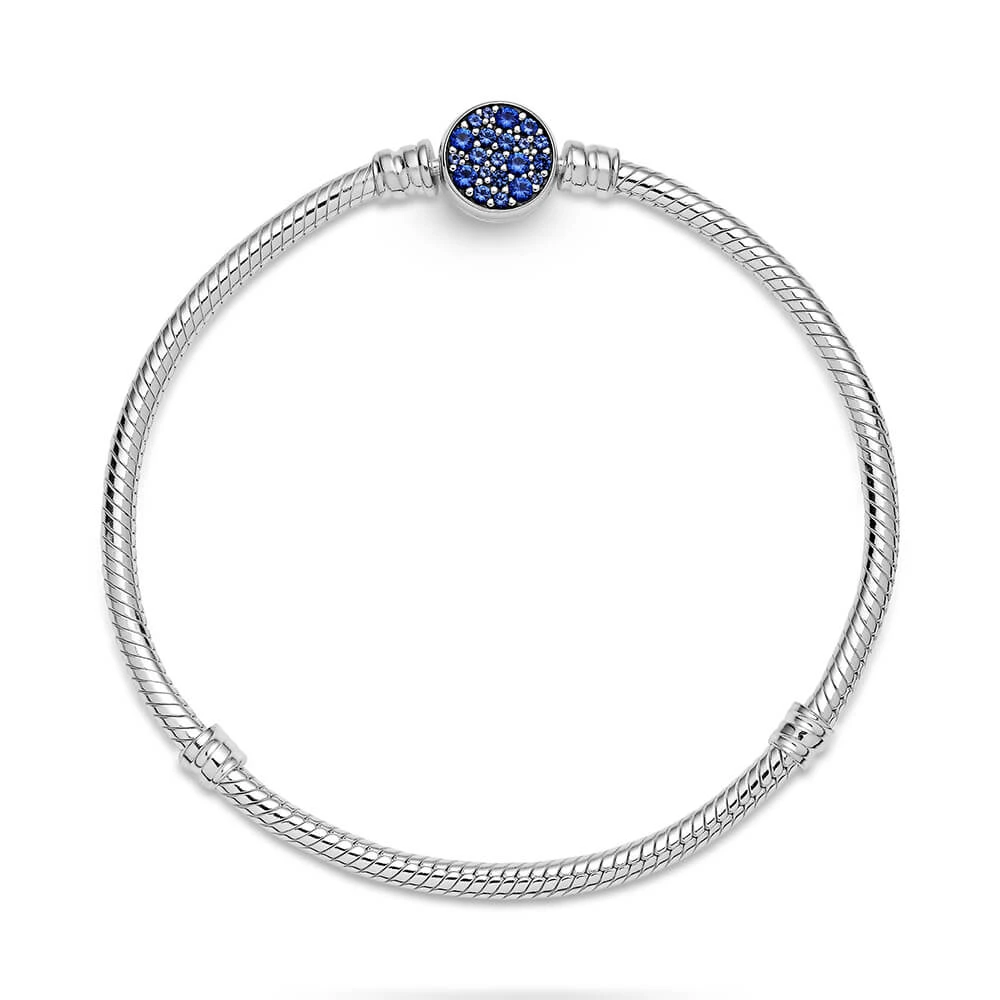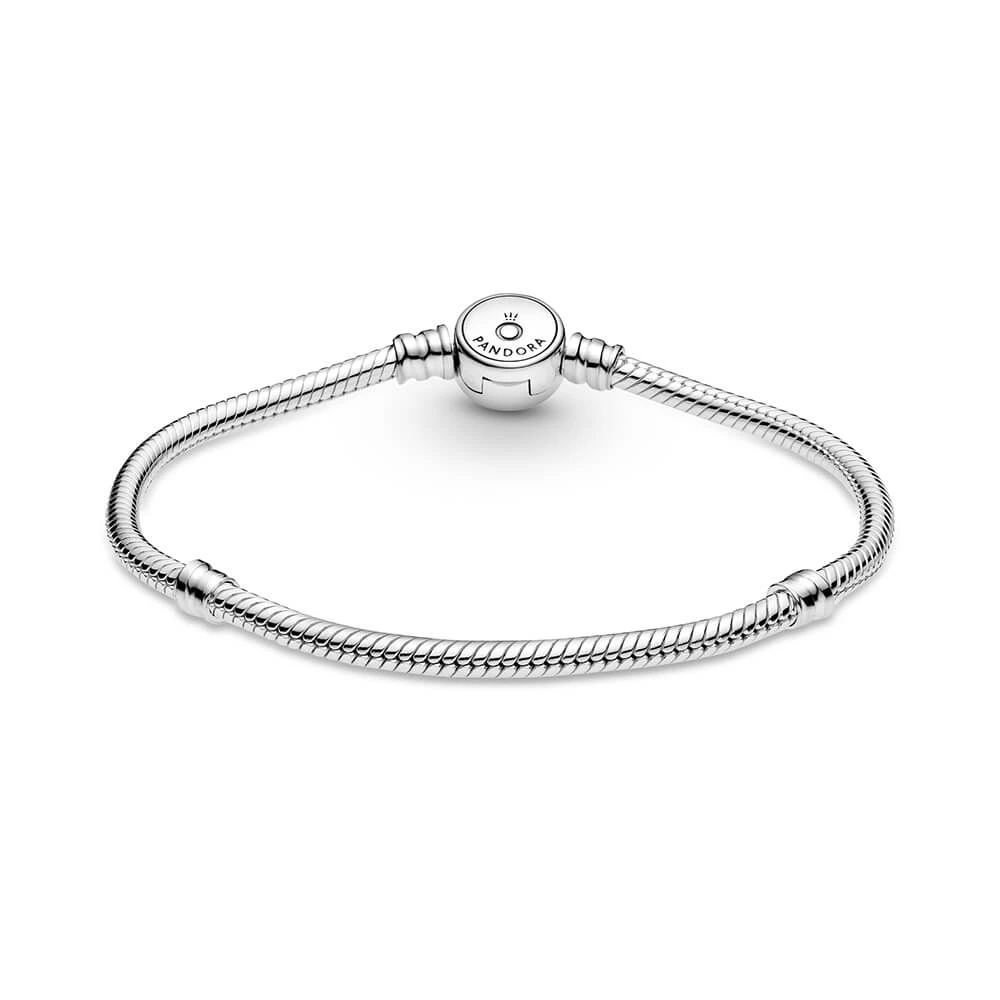 For a hint of color, look to the Pandora Moments Sparkling Blue Disc Clasp Snake Chain Bracelet. Hand-finished in sterling silver, this piece features Pandora’s iconic snake chain. The small disc-shaped clasp is decorated with sparkling blue crystals in different sizes, with the polished reverse side including the Pandora Crown O monogram and logo. Pair with colorful charms for a vibrant addition to your look.