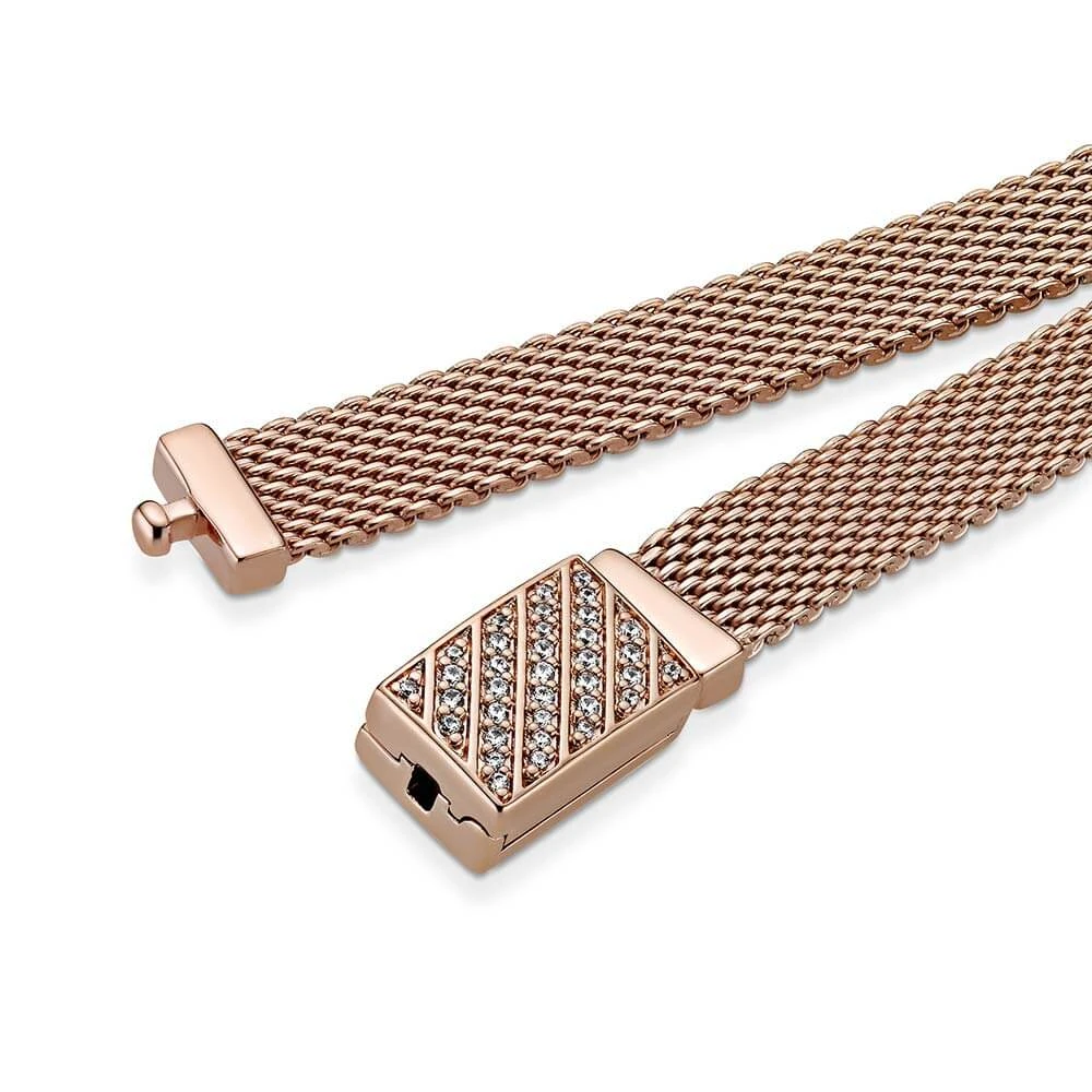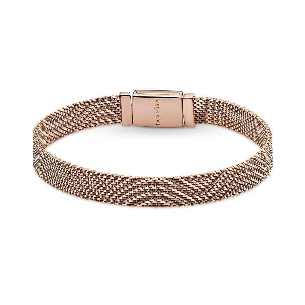 Add some sparkle to your look with the Pandora Reflexions™ Long Clasp Pavé Bracelet. Featuring an elongated clasp shape with diagonal rows of clear cubic zirconia pavé on the front and a polished back with Pandora logo, this 14K rose gold-plated fine flat mesh bracelet is hand-finished. Designed in the modern minimalist aesthetic of Pandora Reflexions™, this warm-toned bracelet is a sleek, stunning and sophisticated addition to any look.