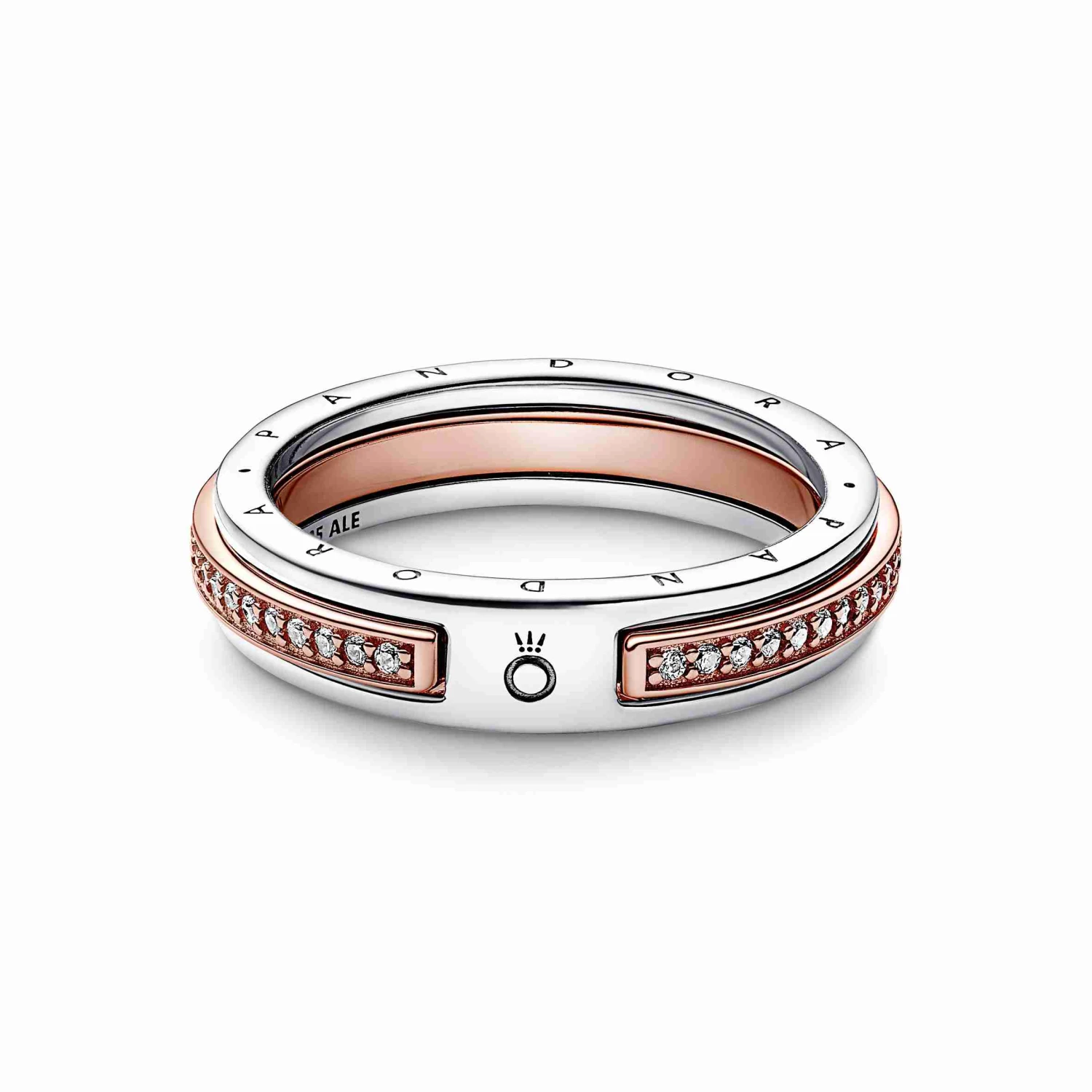 Build your ring stack with the Pandora Signature Two-tone Logo & Pavé Ring. With a two-tone square profile band, this ring has a slightly raised 14k rose gold-plated design running almost all the way around with sparkle in its center. The back of the ring is engraved with the Pandora Crown O, creating a small gap in the rose gold band. A staple for any jewelry collection, this statement ring stands out on its own or in a perfectly curated stack.