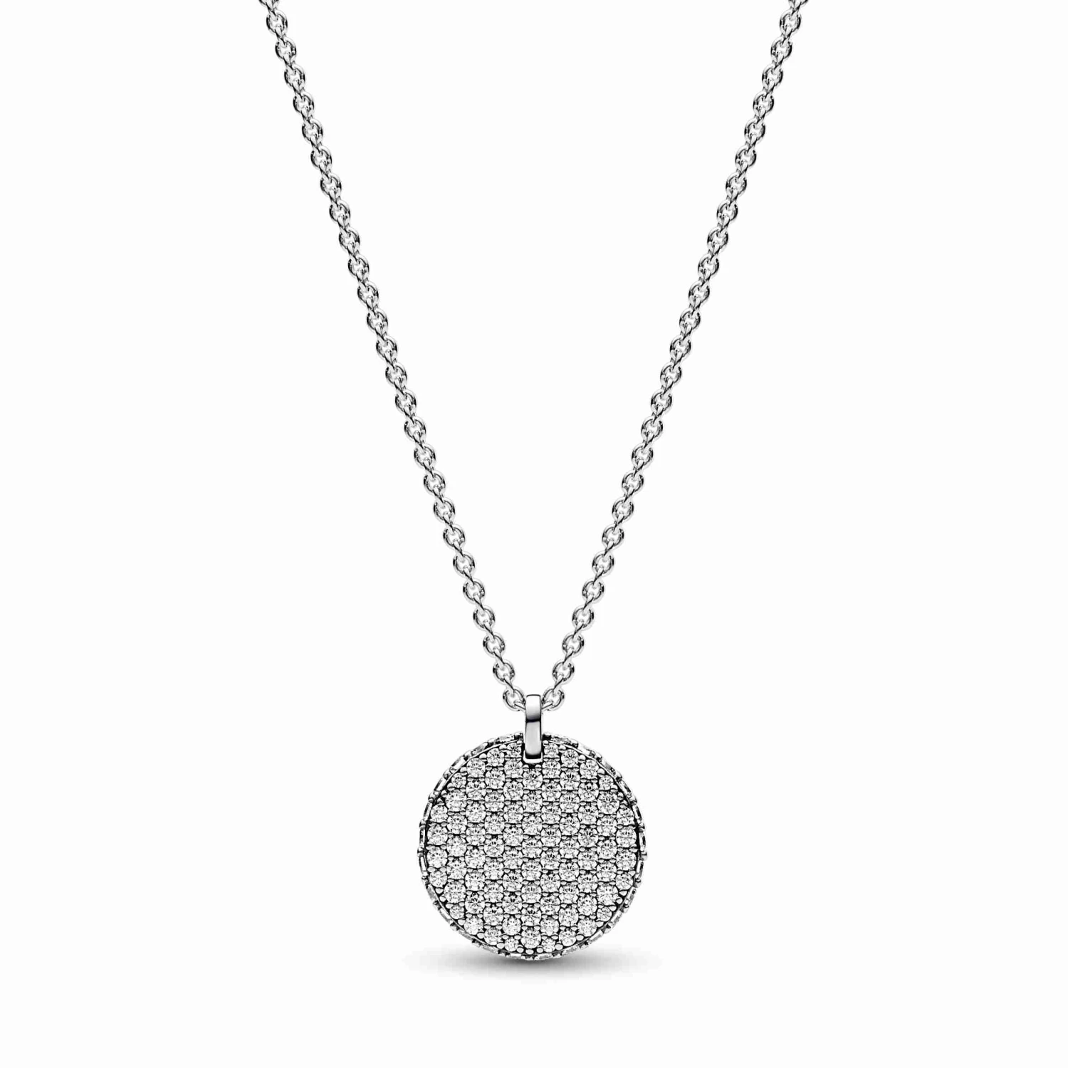 Let your sparkle do the talking with our Pandora Timeless Pavé Round Pendant Necklace. Featuring a medallion-inspired disc covered with 89 clear cubic zirconia, this sterling silver necklace is perfect for all those that love to shine bright. All of the stones face outward and even the edge of the medallion is encrusted for a three-dimensional effect. The back of the disc features an engraving of the Pandora logo. Let your love for sparkle shine with this unique piece or gift it to the person that lights up your life.