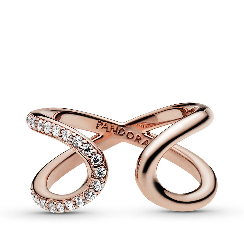 The ultimate symbol of eternal love, the infinity symbol is reimagined in this Wrapped Open Infinity Ring. Wrapping elegantly around your finger, choose to wear it facing front or back, simply move it around as the mood strikes. This 14K rose gold-plated ring is finished with 21 round brilliant-cut cubic zirconia, making it the perfect statement, symbolising the power of an infinite connection through its directional design and generous dimensions.