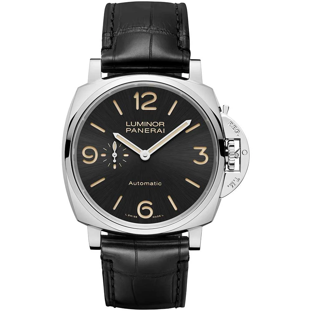 The new Luminor Due 3 Days Automatic has the P.4000 calibre. the thinnest automatic calibre developed by the Panerai Manufacture. The most distinctive feature of this calibre is the decentralized micro-rotor which rotates in both directions, feeding energy into the two spring barrels which accumulate a power reserve of three days. The balance bridge is the type with twin supports, more secure and stronger than the single cantilever balance cock, and the watch also has the device which stops the balance wheel when the winding crown is pulled out, for synchronizing the time perfectly.