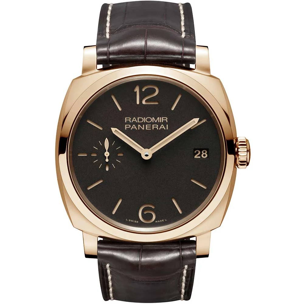 THE HISTORIC FASCINATION OF THE RADIOMIR 1940 CASE IS MAKING ITS DEBUT IN THE HISTORIC COLLECTION OF OFFICINE PANERAI WITH THE NEW RADIOMIR 1940 3 DAYS in red gold, fitted with the P.3000 calibre, a hand-wound mechanical movement with a power reserve of three days. In the Radiomir 1940 3 Days Gold Rose the essential forms of the Panerai design have been integrated with the technical solutions for an haute horlogerie sports watch, which have influenced the materials chosen and the construction of every detail. The dial, with the small seconds hand at nine o’clock and the date window at three o’clock, has the sandwich structure of two superimposed plates with the luminous material between them, the light of which emerges through the holes in the upper plate corresponding to the hour markers. This type of dial construction was designed by Panerai in the late 1930’s to provide greater brightness and legibility.