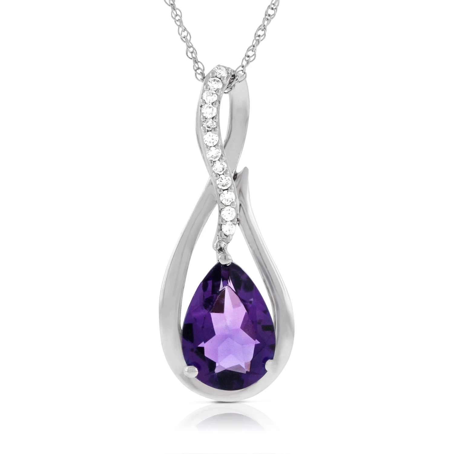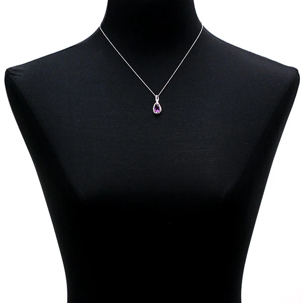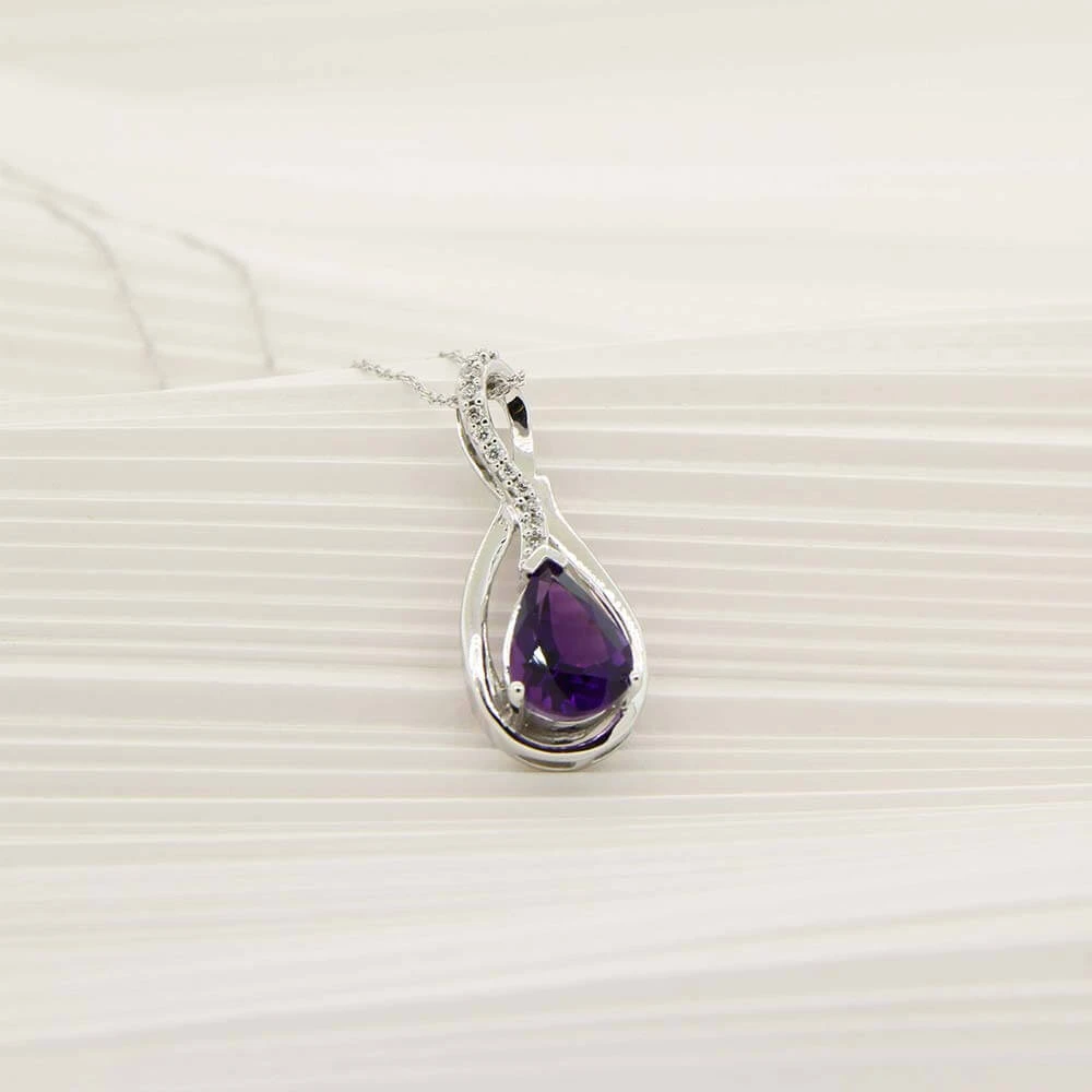 Pear shaped amethyst pendant with a cascading wave of diamonds in 14K white gold. Diamonds equal 1/15 carat total weight, delicate 18″ chain included.