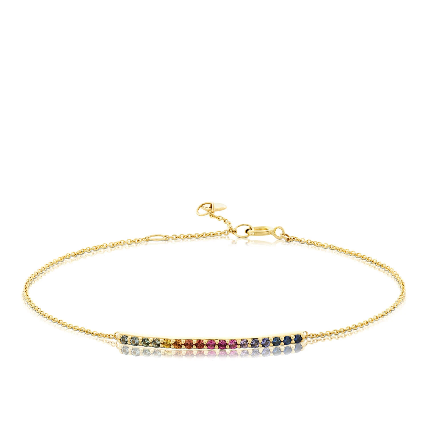 A yellow gold chain presents a rainbow array of sapphires on a gently curved bar to perfectly rest on a wrist. This simple bracelet is sure to bring a fun burst of color to your everyday. Bar is approximately 30mm long. Bracelet is 7.5 inches long with sizing loops at 7 and 6.5 inches for tighter wear.
