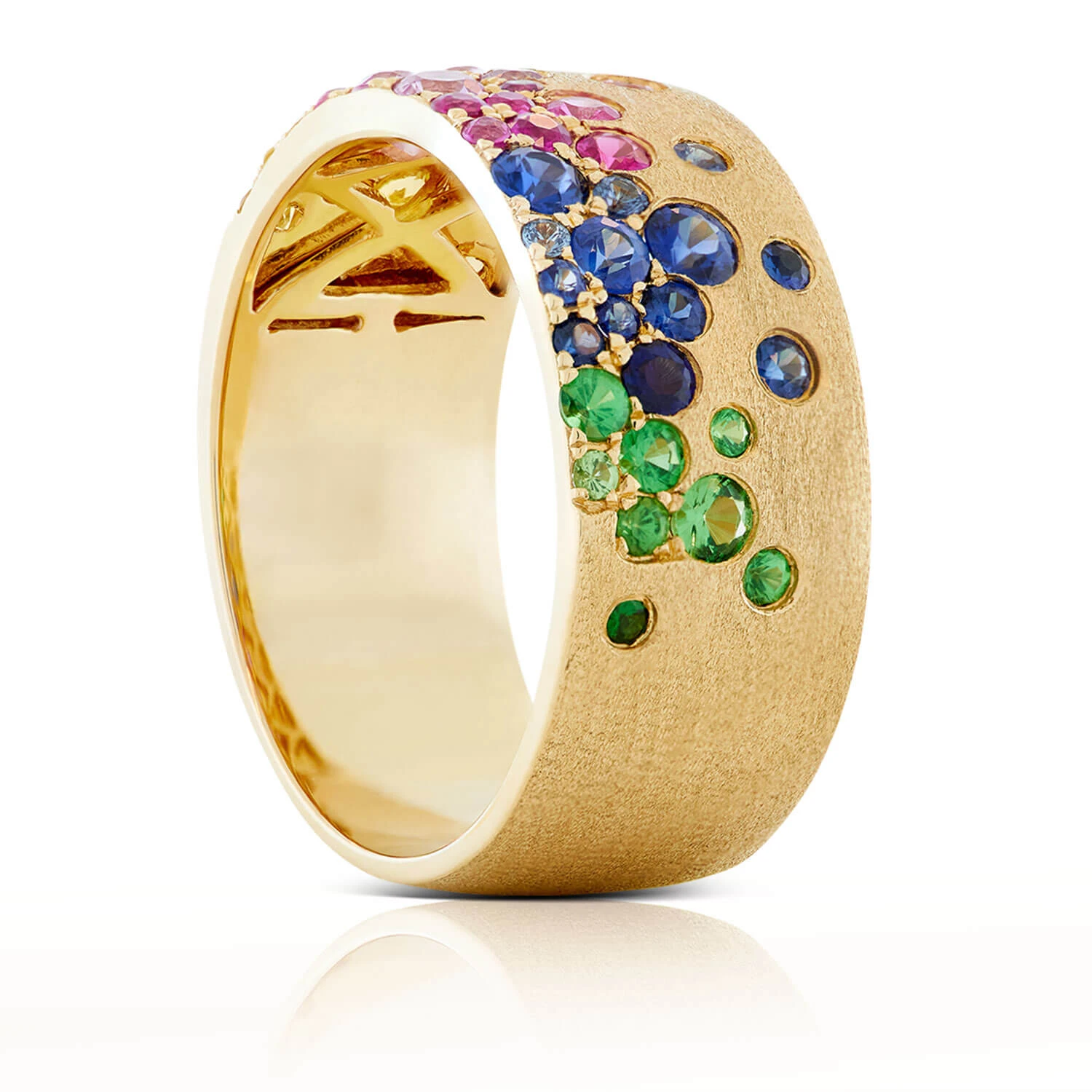 A dazzling display of color, this ring features multicolored sapphires & bright green tsavorite garnets that form a bubbly pattern across the front. A brushed satin finish adds a touch of softness. Size 7 only. Due to the unique nature of this design, this ring cannot be sized.