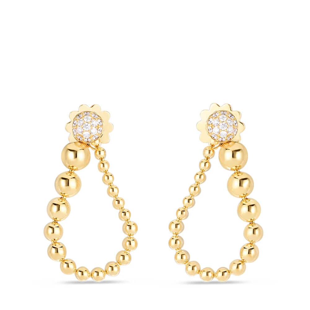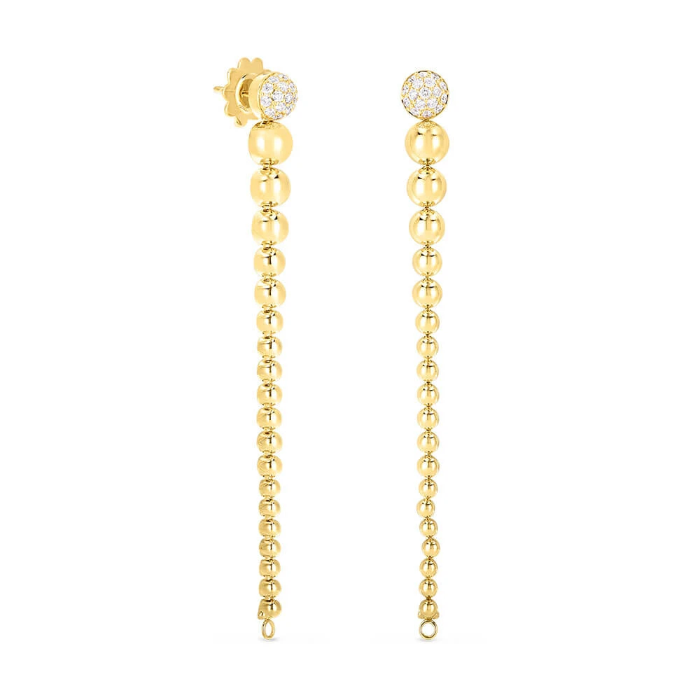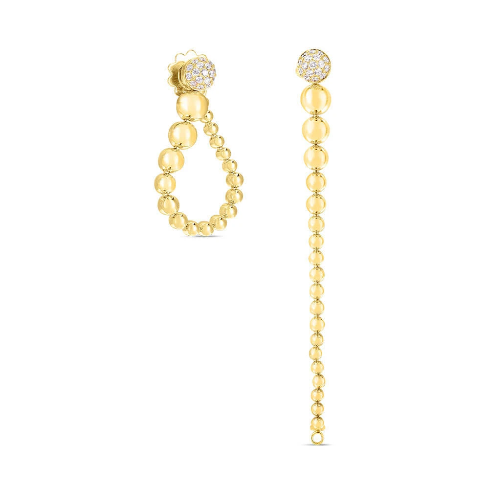A diamond-encrusted ball stud presents dripping graduated high polish beads. A small loop at the end allows you to switch from shoulder dusting drops to stylish front to back hoop earrings to suit every ensemble. For an avant-garde asyimetrical styling, wear one earring at its full length and the other as a hoop. Earrings are approximately 75mm long when worn as shoulder dusters, and 30mm long when worn as hoops.