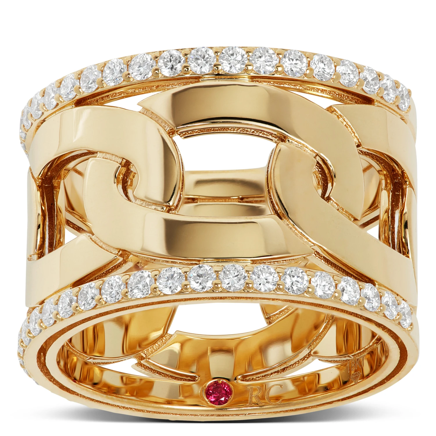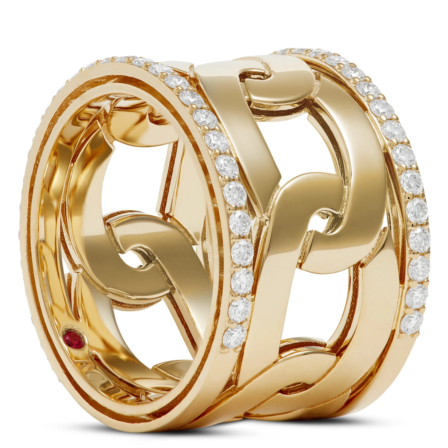 This 18K yellow gold and diamond band is part of the Navarra Collection Designed by Roberto Coin. The ring measures 14mm wide and features open high-polish oval stations all the way around, flanked by two rows of prong set round brilliant cut diamonds. Total carat weight 0.78 carat.
