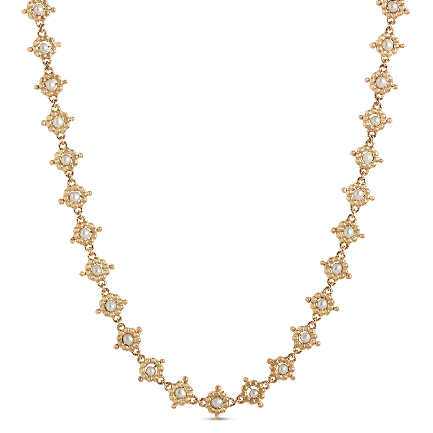 The perfect pairing of pearls and 14k yellow gold keep this station necklace in a timeless balance. Each station showcases a cultured freshwater pearl centerpiece surrounded by a halo of beaded gold. Each element is carefully crafted and impeccably executed, culminating in a piece to love and wear for a lifetime.