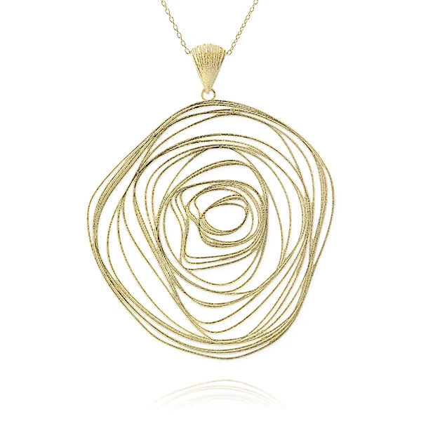 Curled medallion pendant with satin brushed finish, in 14K yellow gold. This large pendant’s fine organic circle shape creates a balance of statement and style, both grand and delicate. Medallion is 2″ in diameter, 24″ chain included.