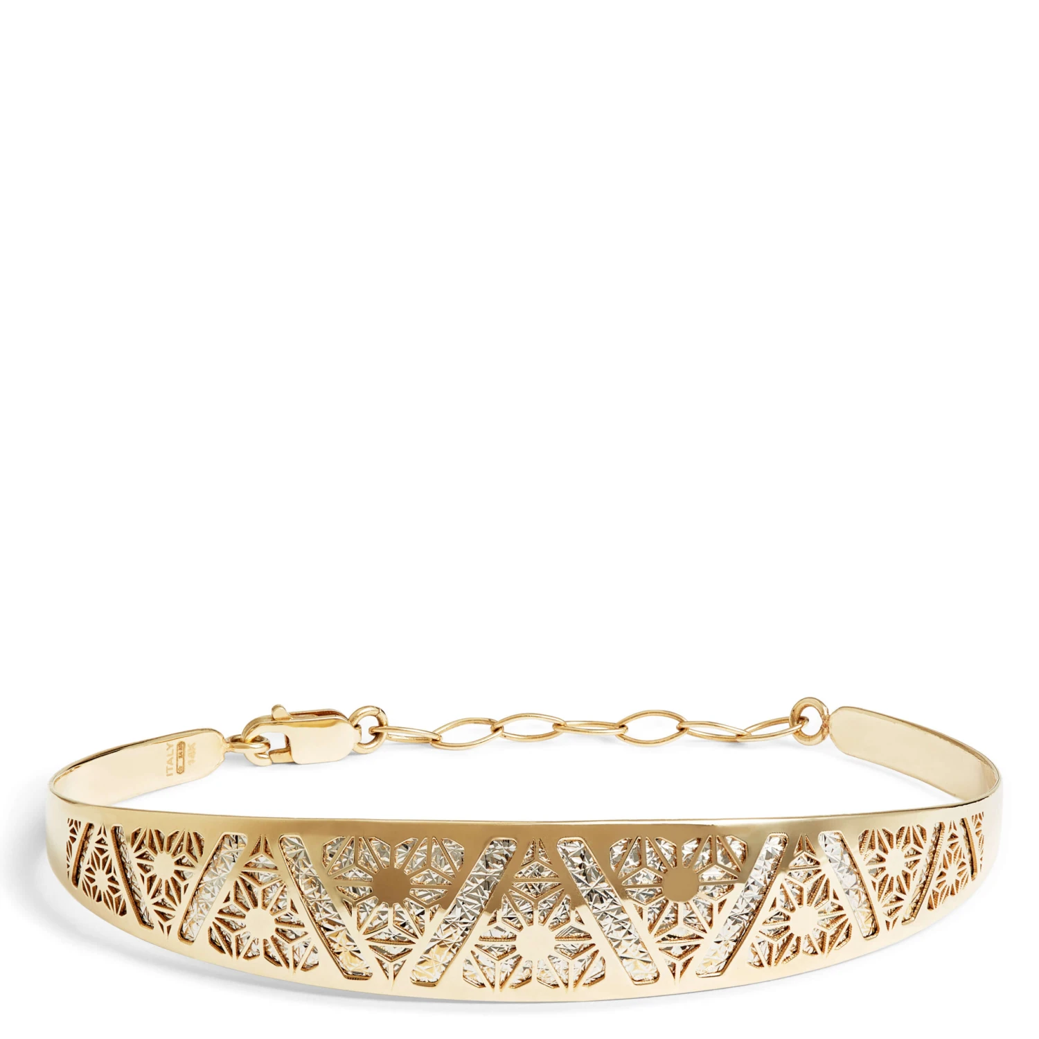 Intricate laser cut gold overlays a diamond cut white gold surface underneath for a beautiful combination of sparkle and depth. This showstopper of a bangle is graduated in width from 3 to 12mm and ends with a delicate chain and lobster clasp. The adjustable chain section allows the bangle to flex between 6.5 to 7 inches to fit most wrists.
