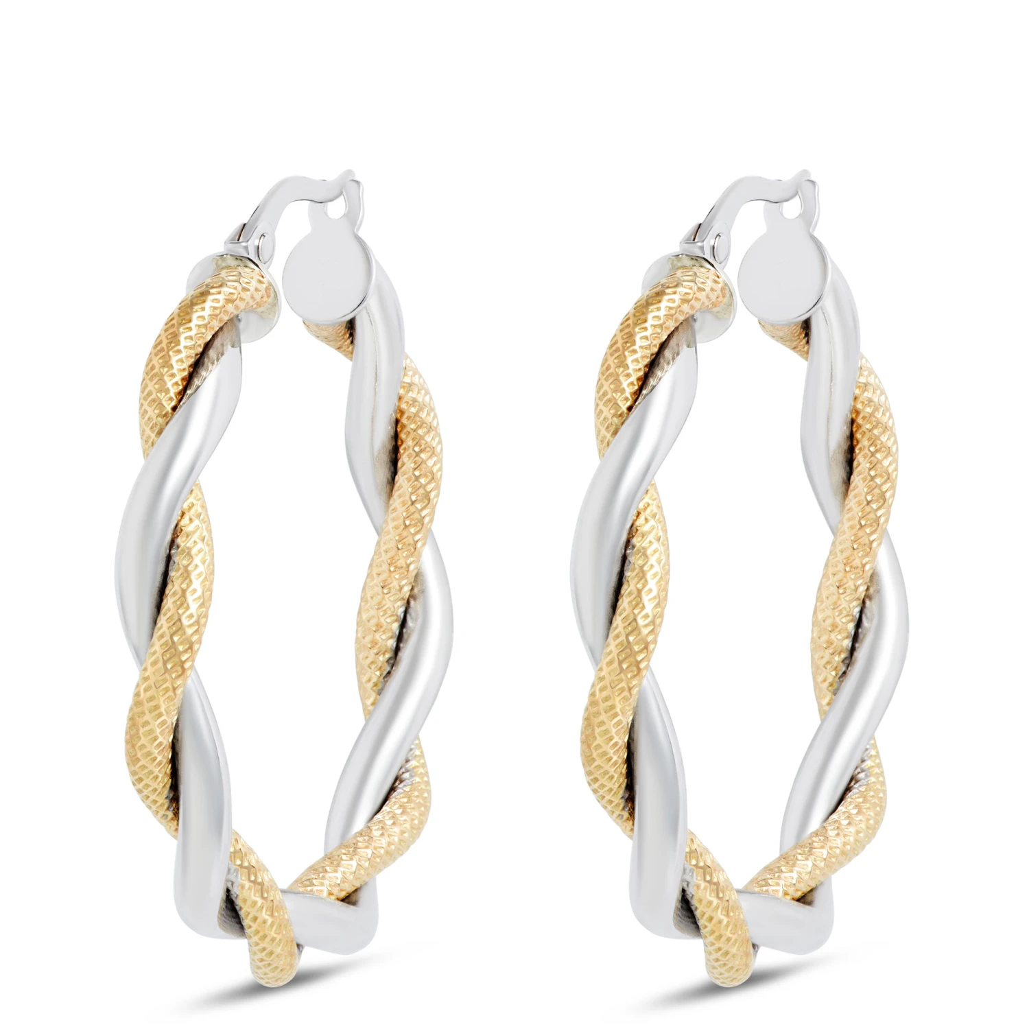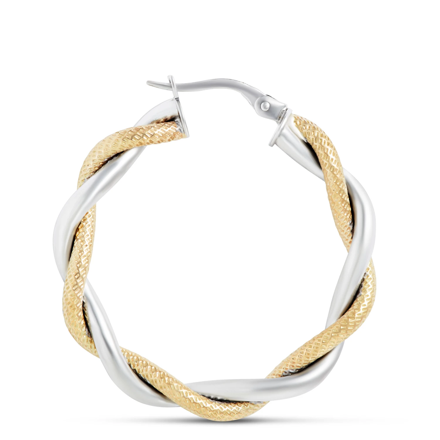 Mesh textured and bright high polished finish hoop earrings with a twist design, in yellow and white gold.